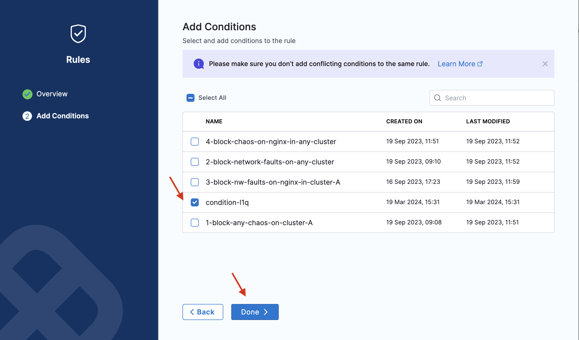 In the Chaos module, select ChaosGuard, and select Conditions. The Conditions page lists existing conditions (if any).