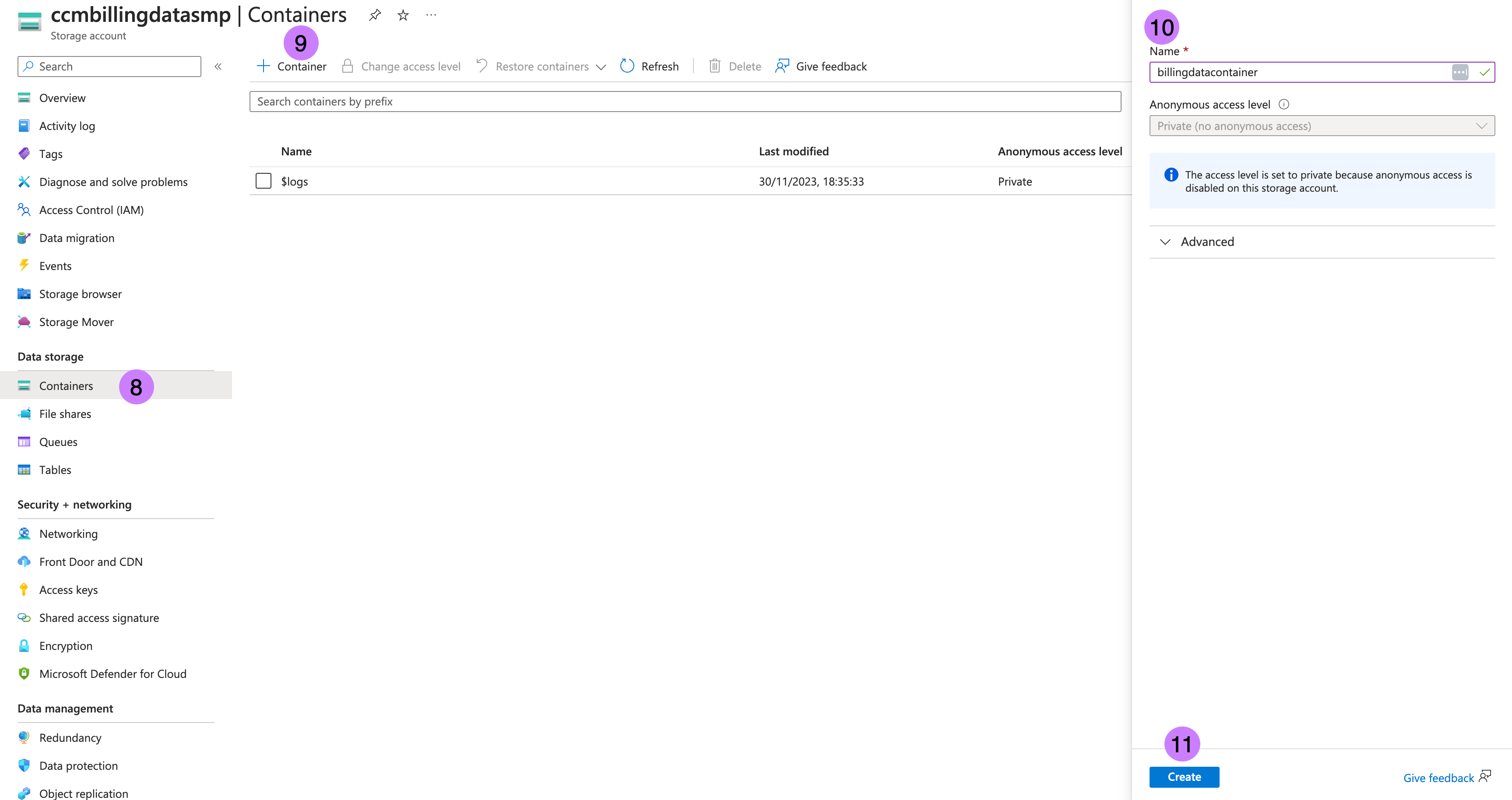 - Once the storage account is created, navigate to the storage account then to Containers in left panel.