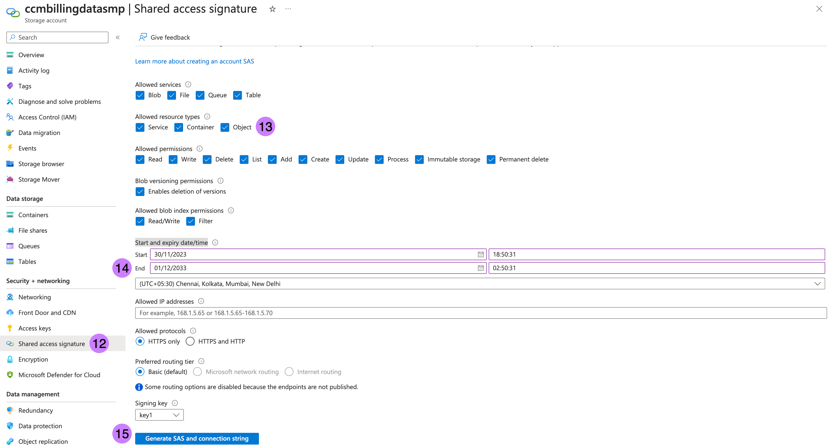 - Click on Generate SAS and connection string. This is required to sync data from multiple source account to destination storage account.