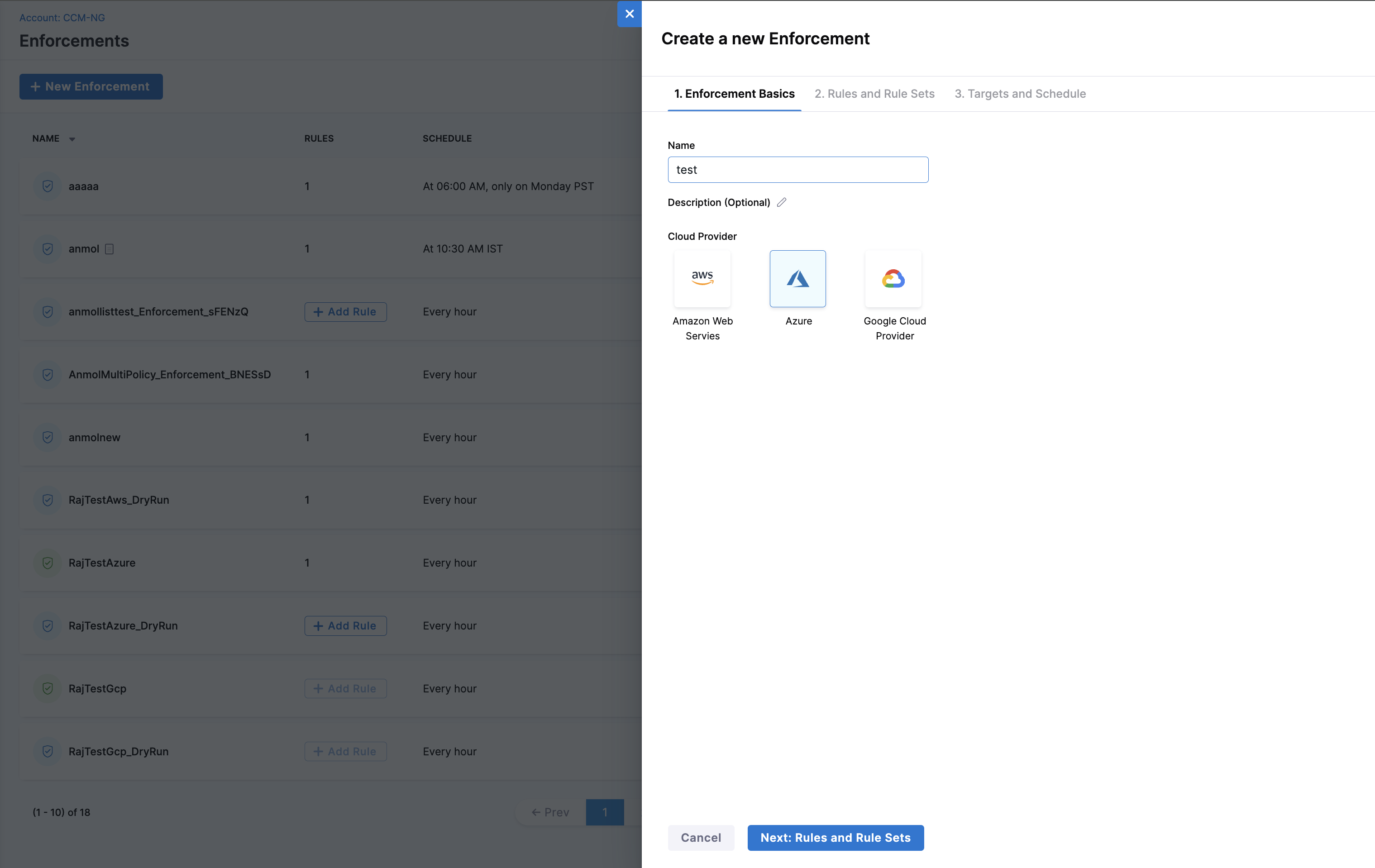 Enforcements enable you to enforce a certain set of Rules or Rule Sets (also known as governance guardrails) against a specific set of targets (accounts, projects, or subscriptions) to run periodically. Sometimes, we need rules to run periodically, such as every day, week, or month. However, running these rules manually every day or week at a specified time creates extra overhead and is a slow process prone to manual errors. To solve this, Enforcements allow users to set up a timely schedule and choose the day, time, and frequency for their rules or rule sets.