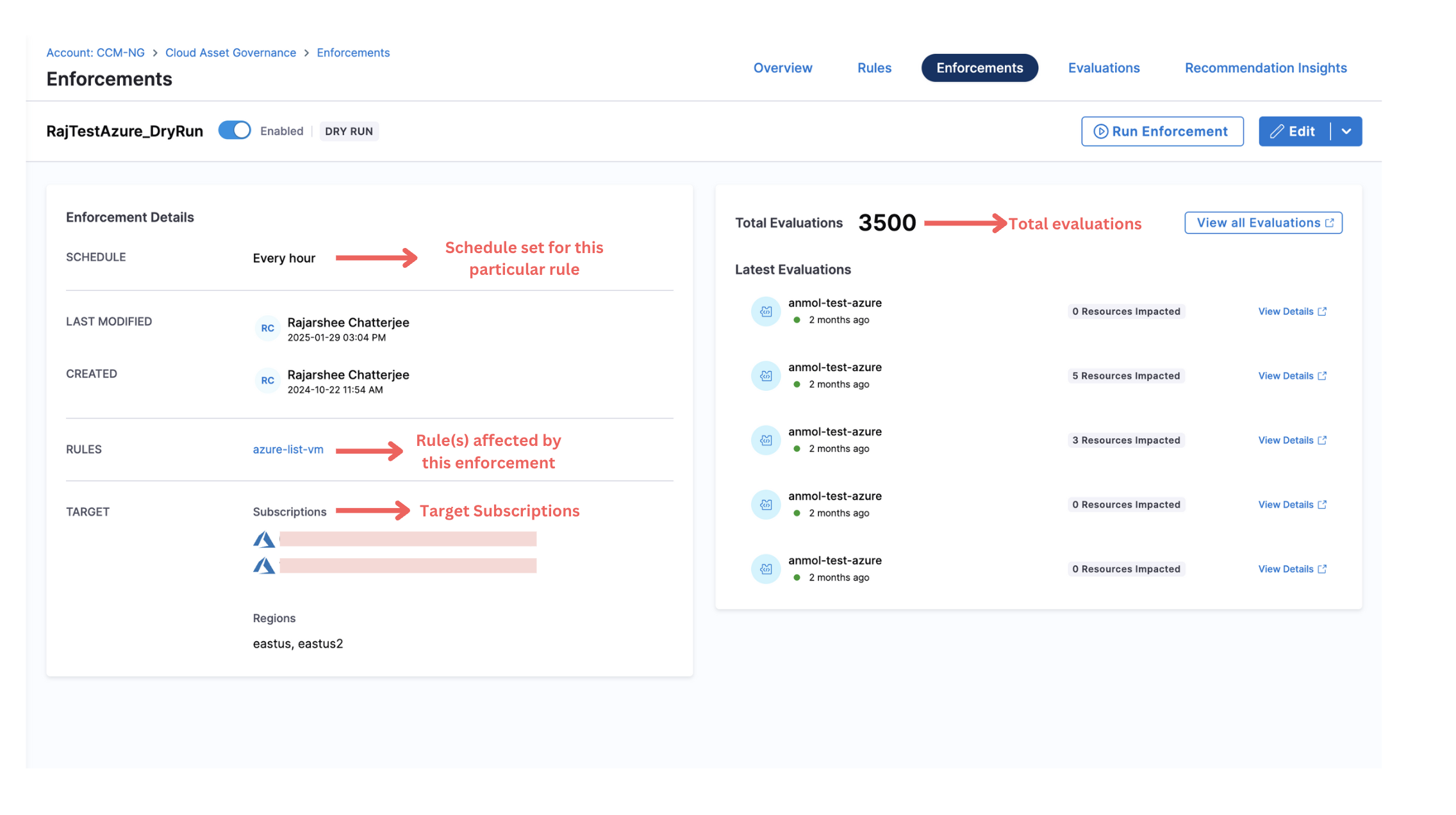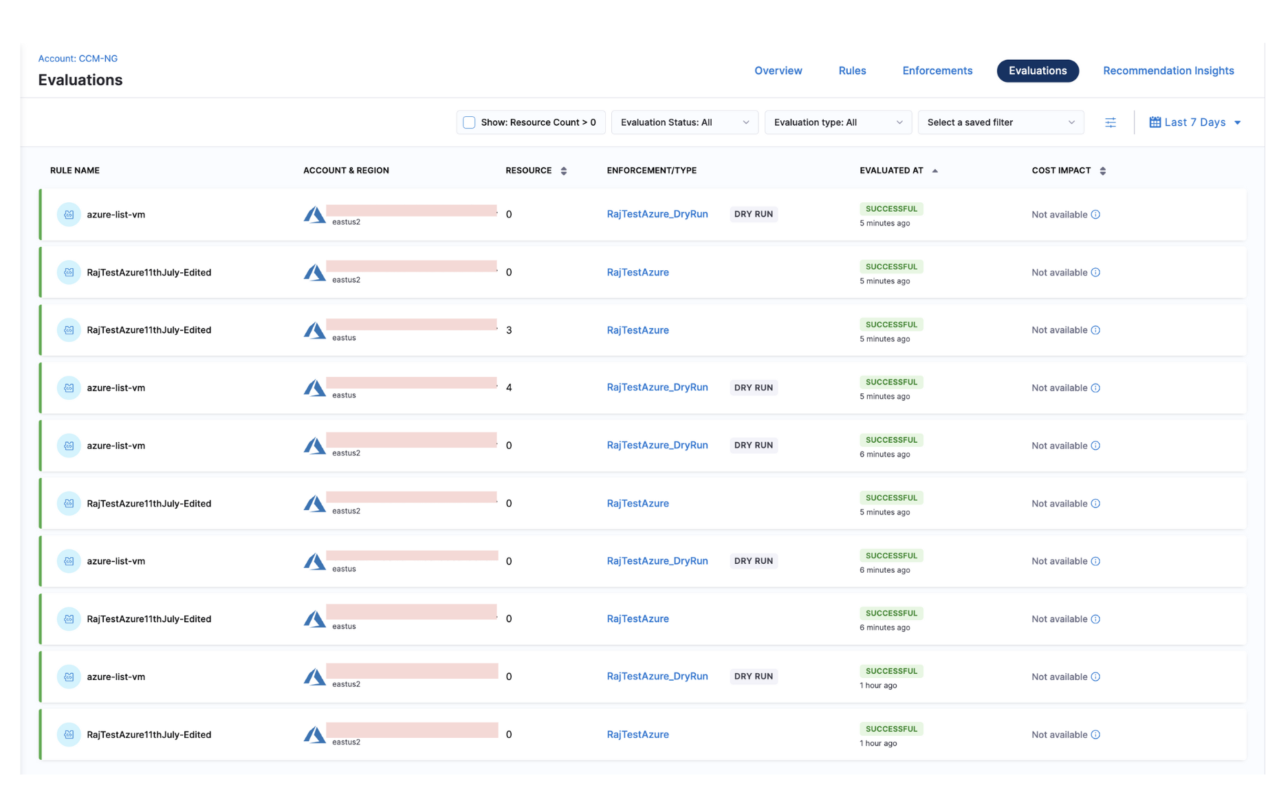 Evaluations include all the data about enforcements run (both RUN ONCE from rule editor and from Enforcement). The Evaluations window also shows you the total cost impact with each Enforcement i.e. the costs or spendings associated with each Evaluation along with the last time that Rule/Rule set was enforced. With Evaluations, you can view and audit all the Enforcements that ran in the past.