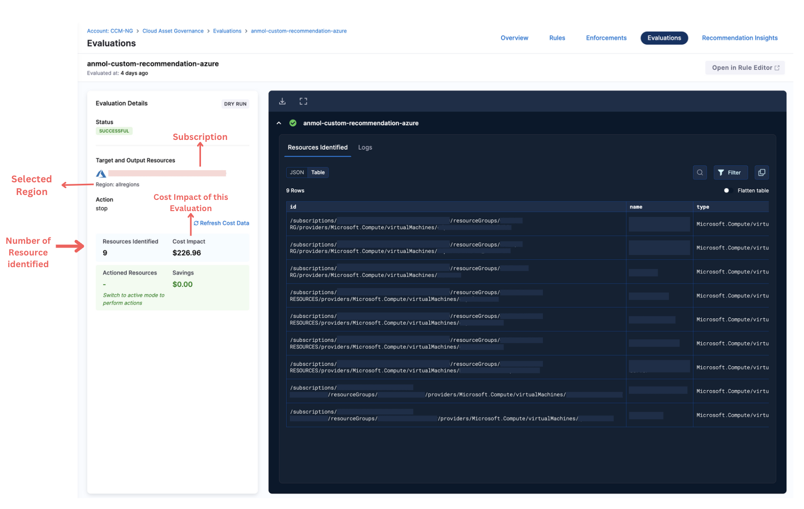 - Select the rule for which you want to view the Evaluation details. The target subscription, region, identified resources and evaluation logs are displayed.