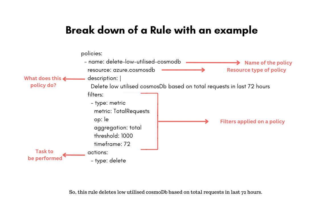 So essentially, a Rule is a file that includes logic defined by a policy that performs certain actions on the resource based on the filters provided by the user. Rules can include multiple policies, and policies include resource, filters and actions.
