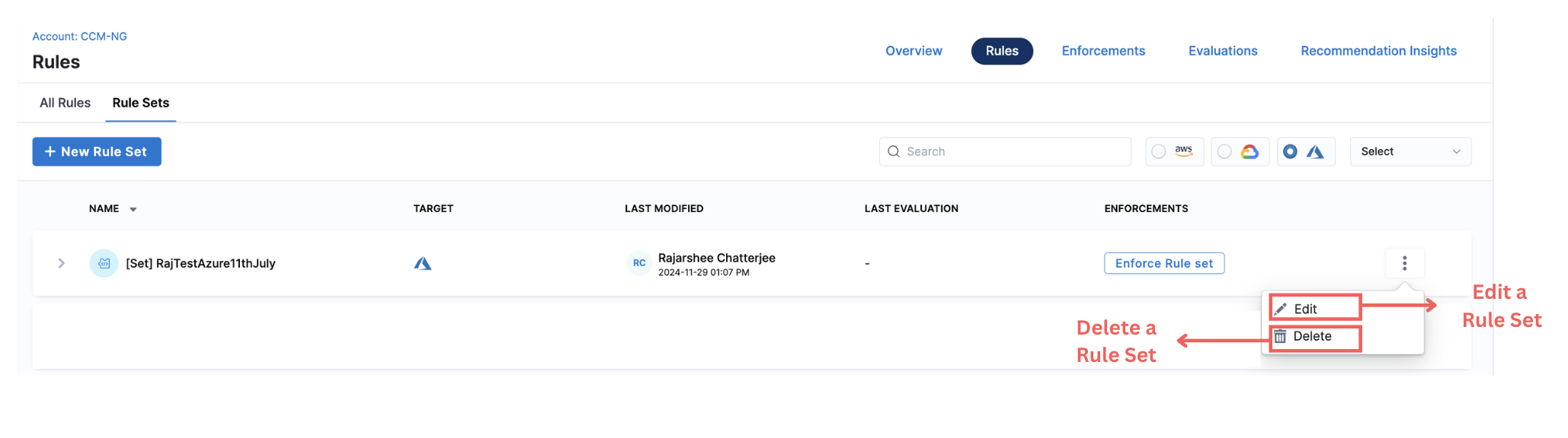 To delete a Rule Set, click on Delete from the vertical ellipsis menu (⋮).