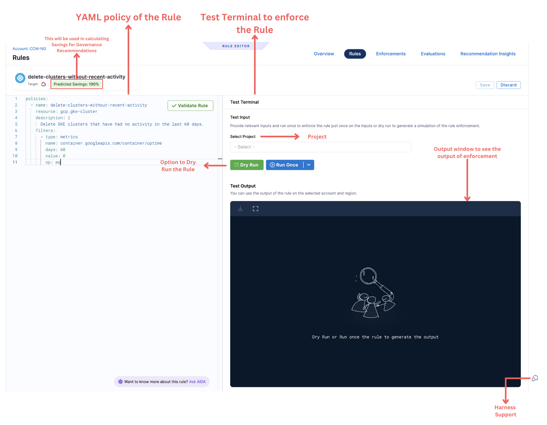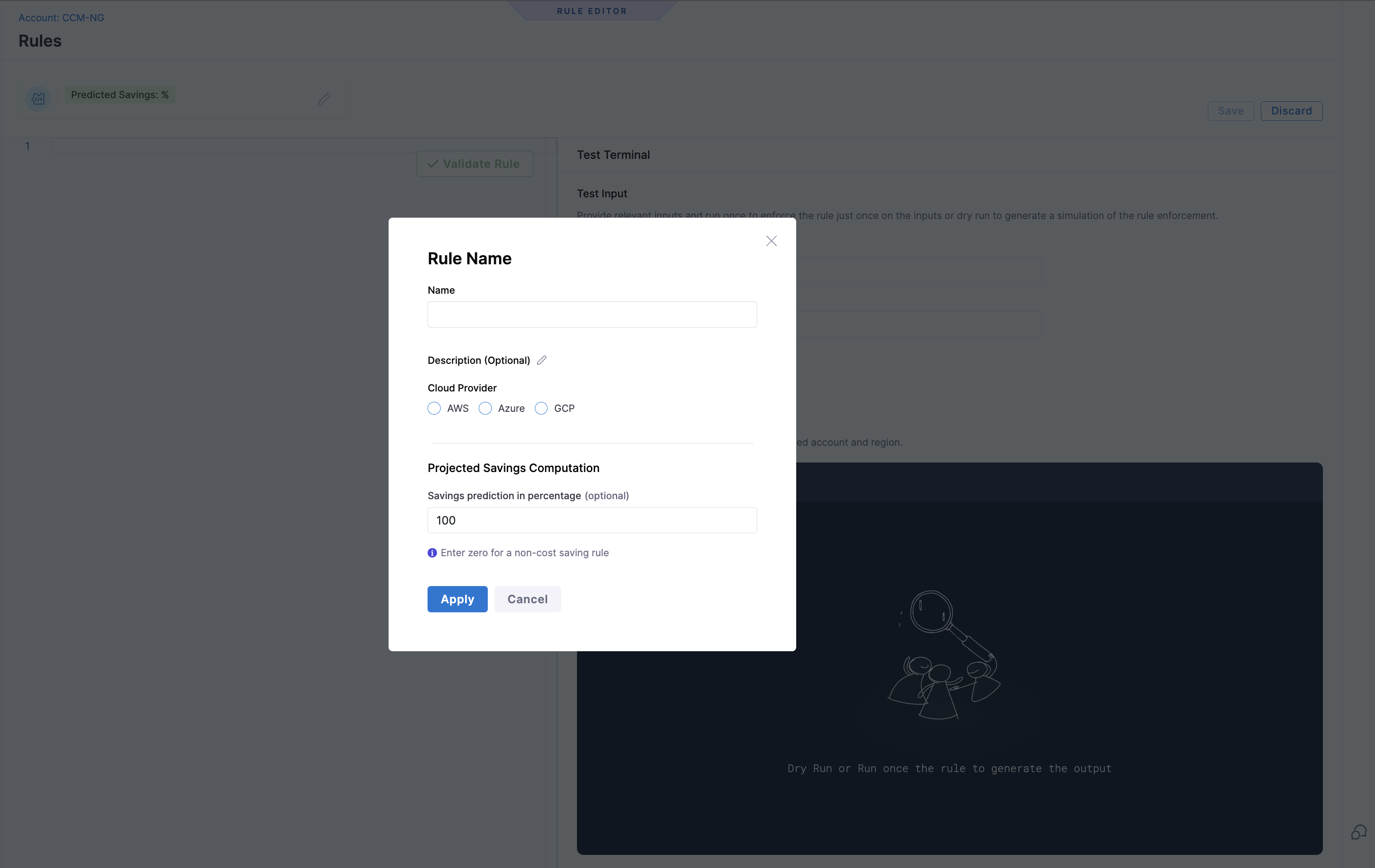 In the rule editor, a test terminal is present for users to see the output in the terminal itself upon evaluating a Rule. This is done to ensure that users can run the rules and try accordingly to check how the output would look on the selected project. After providing the relevant input, the users can select either to dry run the rule first, run it once or enforce the rule.
