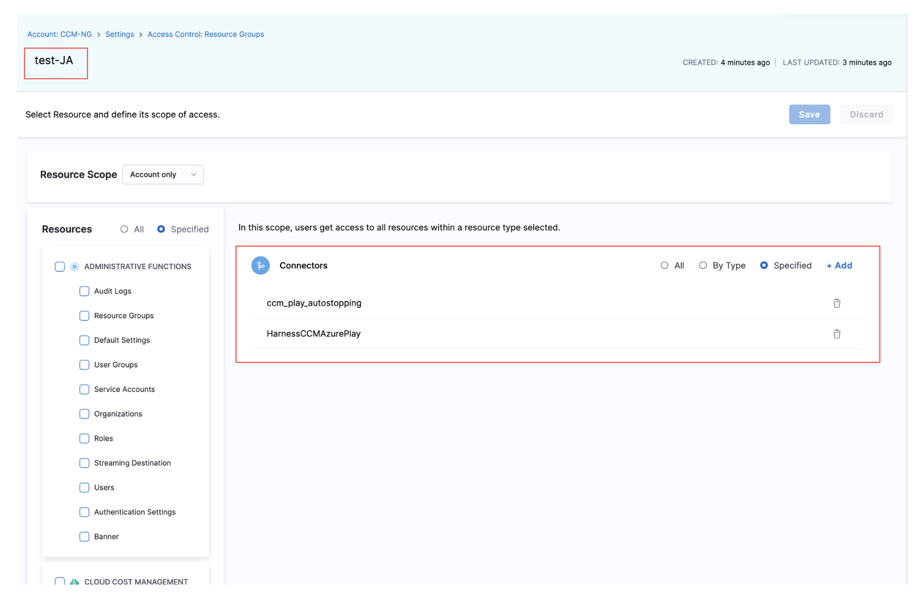 Connectors are shared resources in the Harness account, meaning multiple users can use them. Since they are shared, they appear in the Shared Resources section when creating a Resource Group (RG) in the ACL (Access Control List) module. Admins can create Resource Groups (RGs) for connectors by selecting the relevant connectors.