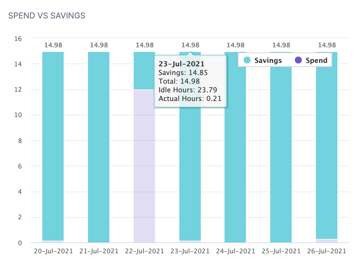 - In Spend vs Saving, view the spend and savings data of seven days for the selected rule. The savings are calculated as the following: