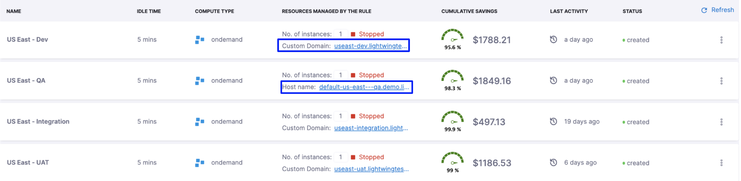 In AutoStopping Rules, in Summary of Rules, click on the Custom Domain or Hostname of the selected instance.