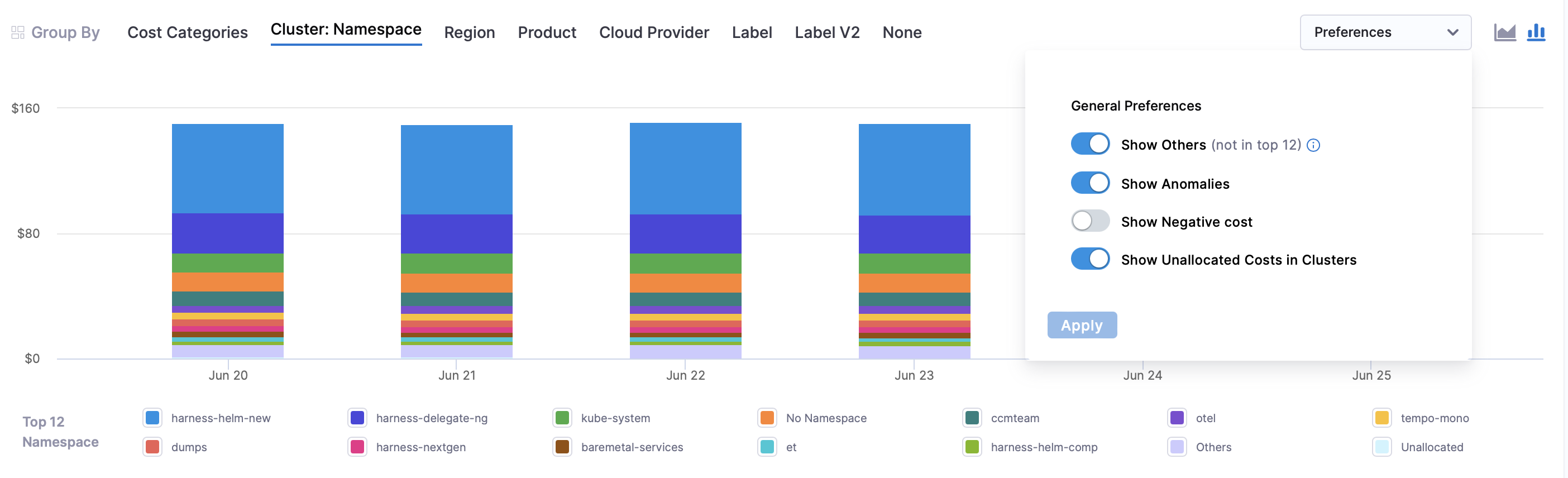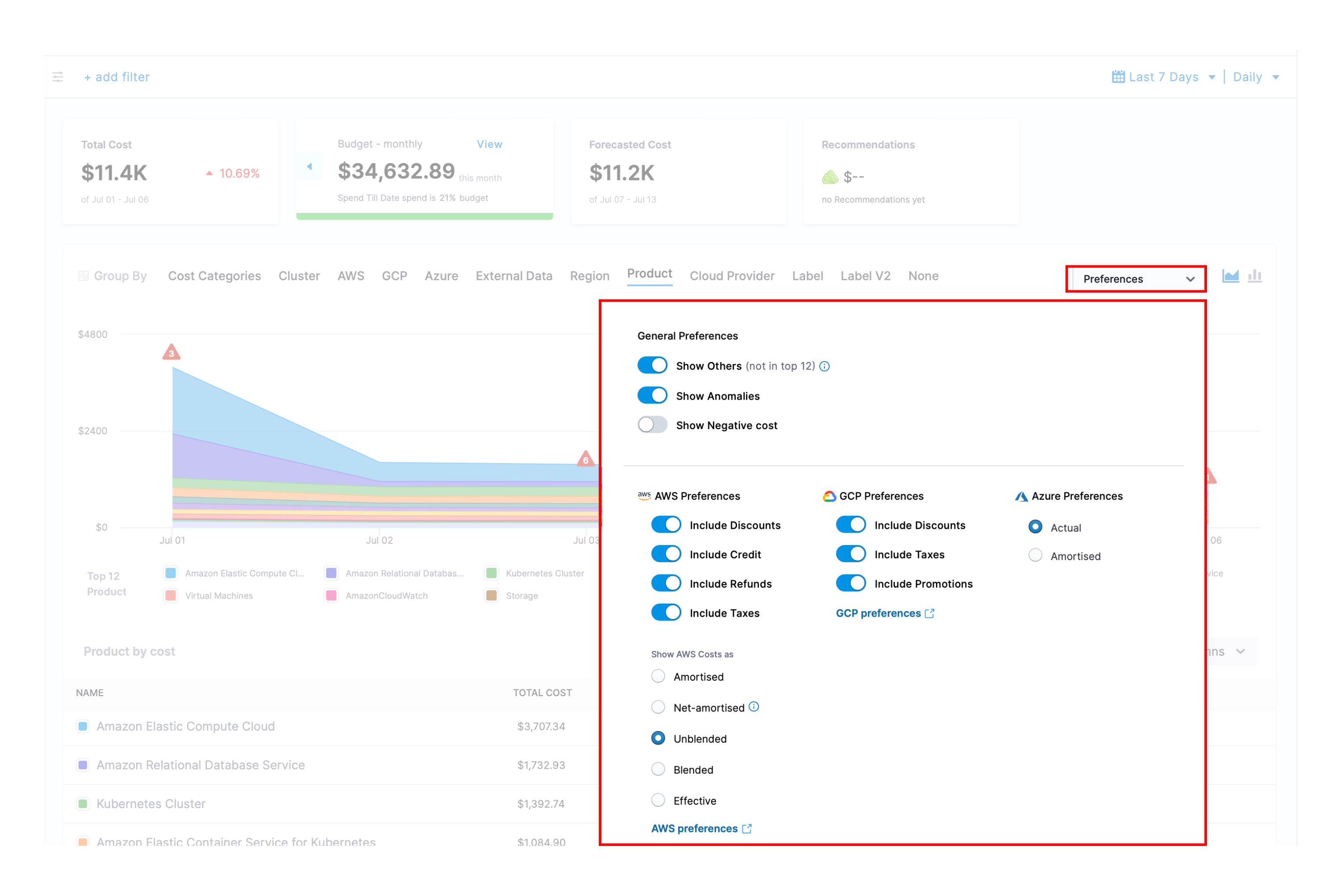 - Cloud Provider: Filter and group costs by the cloud service provider (AWS, GCP, Azure, or Kubernetes clusters) to analyze spending across different cloud platforms.