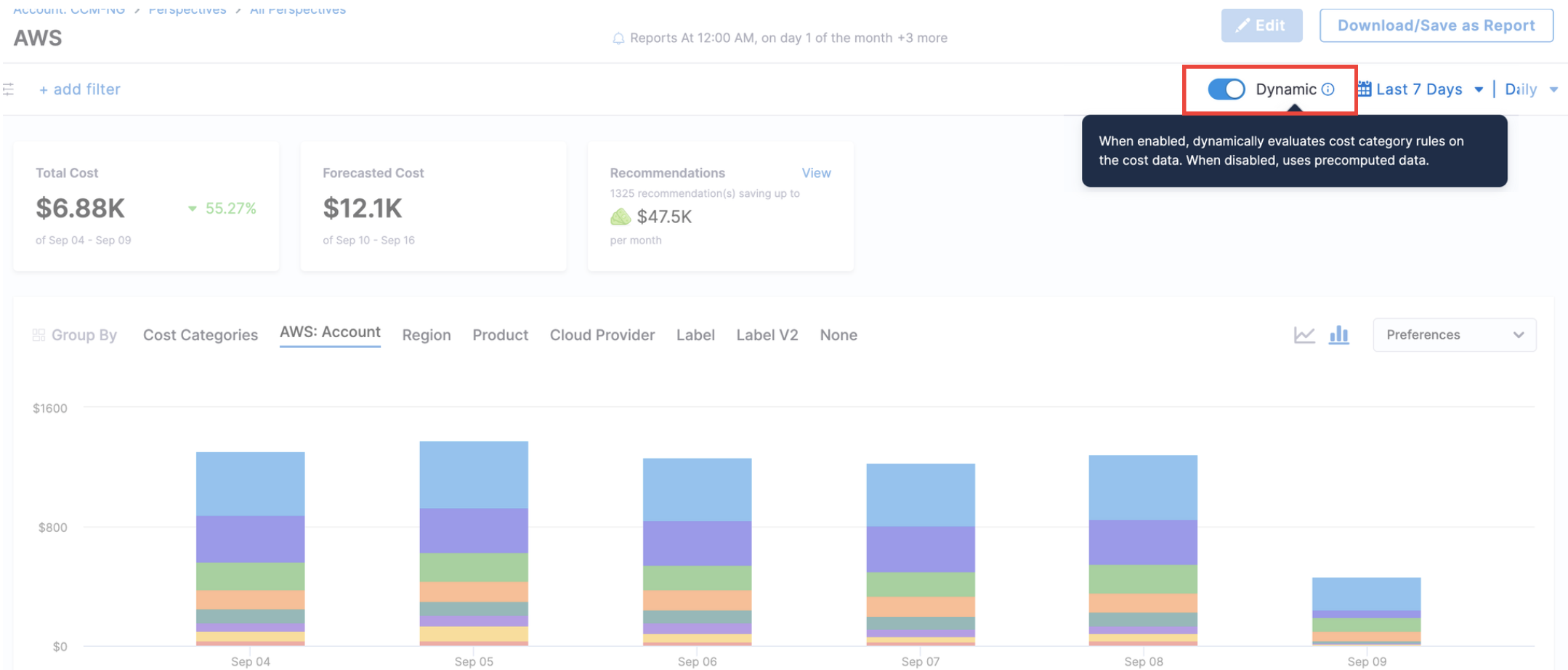 The Dynamic toggle on the Perspective page gives you control over how cost category rules are applied to your cost data. It lets you balance real-time accuracy with faster performance.