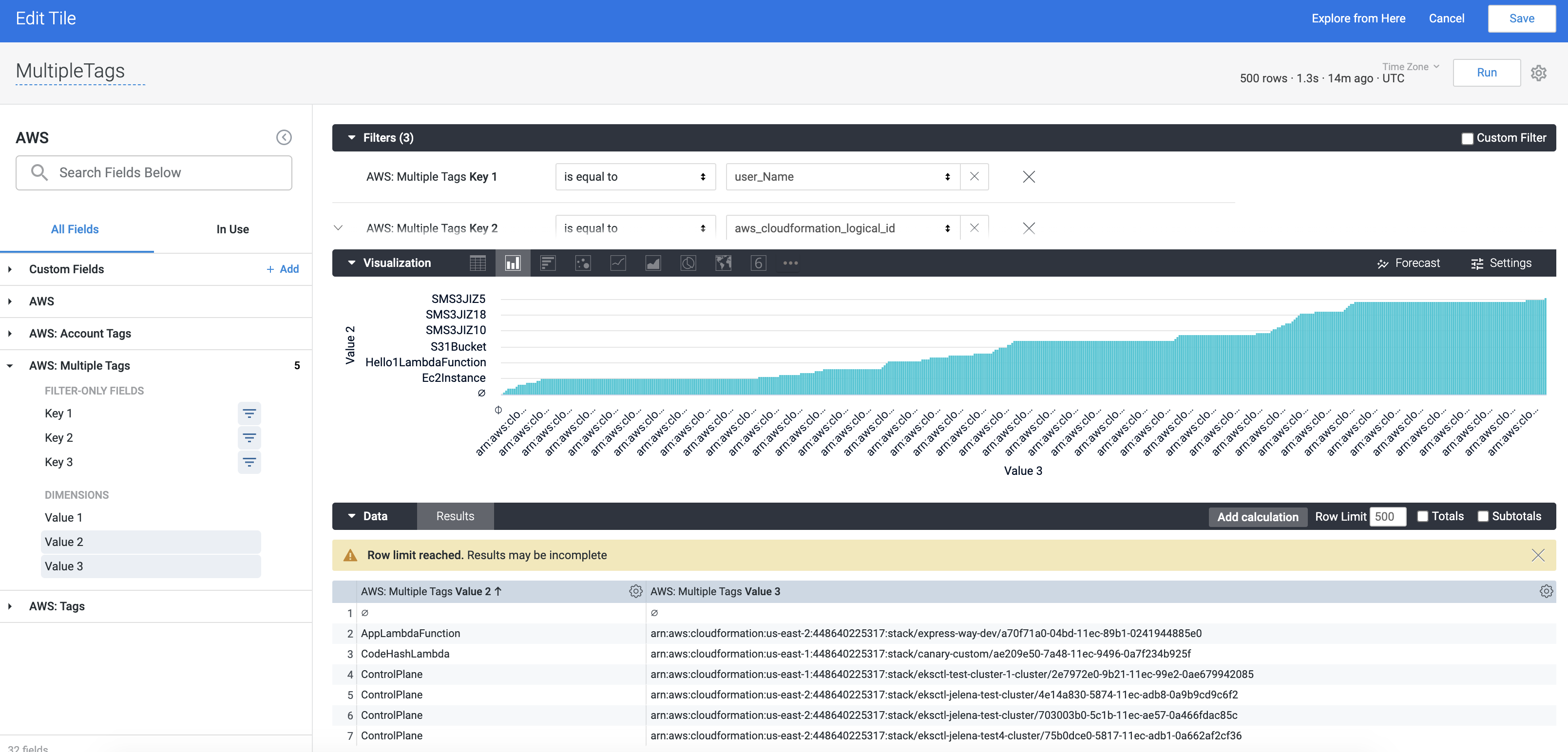 Multiple tags in AWS dashboards can be used to filter and visualize data based on unique Tags and their values. This can be used to drill down the data for specific key values. If you filter AWS: Multiple Tags - Key 1