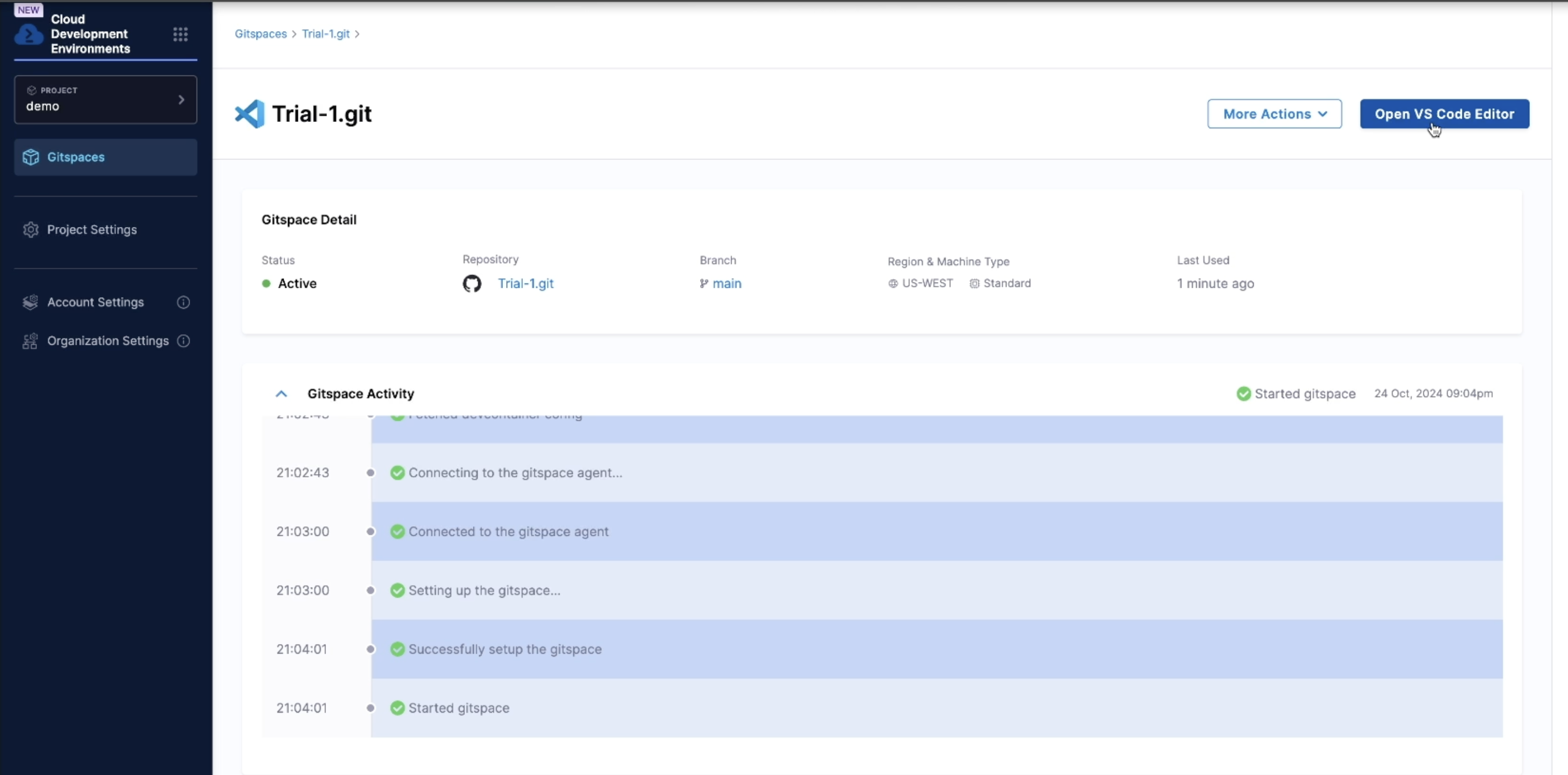 • On-demand nature: Gitspaces can be launched anytime you want with a single click. If you’re working on multiple projects or need a fresh environment for any reason, you can get it instantly.