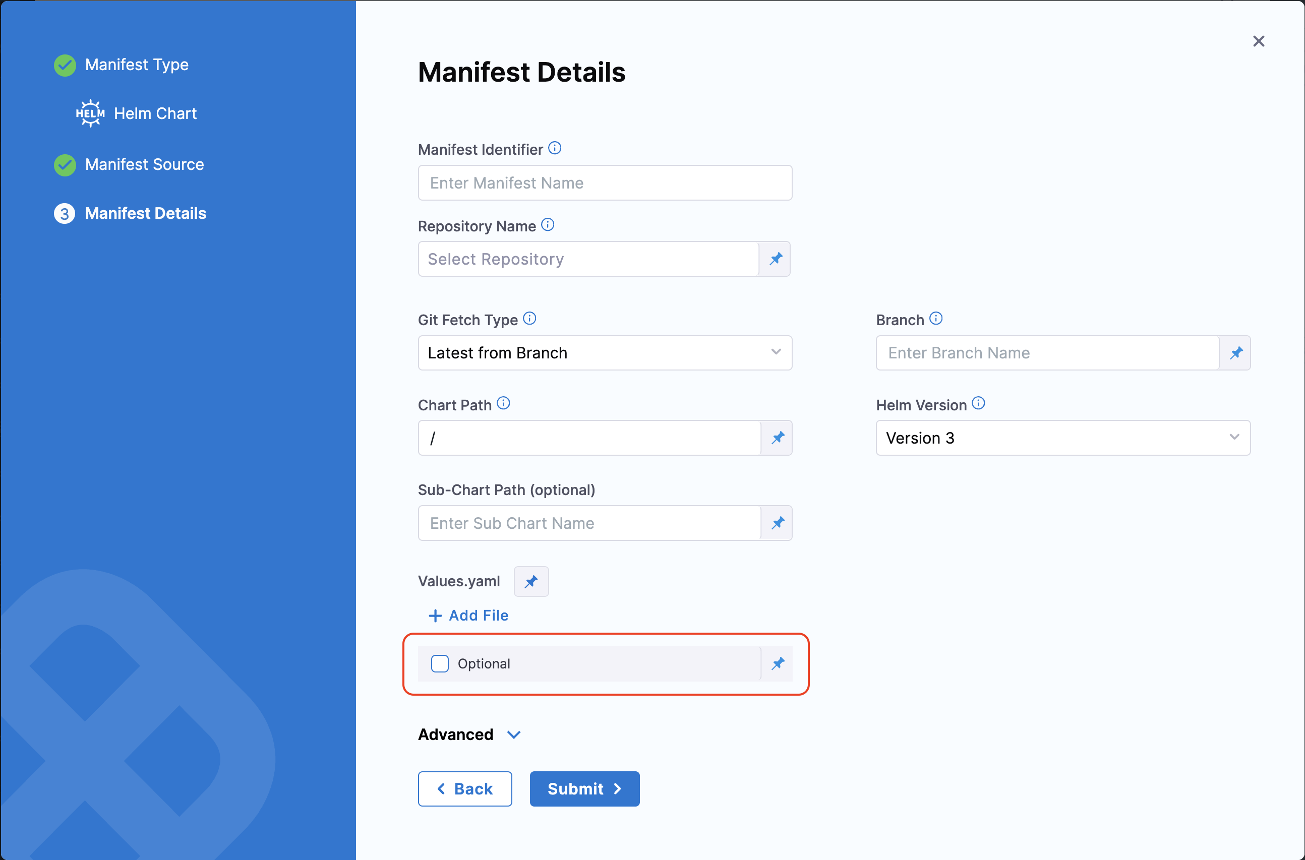 After you select the Cloud Provider option, you can configure the manifest details for fetching the chart from ECR: