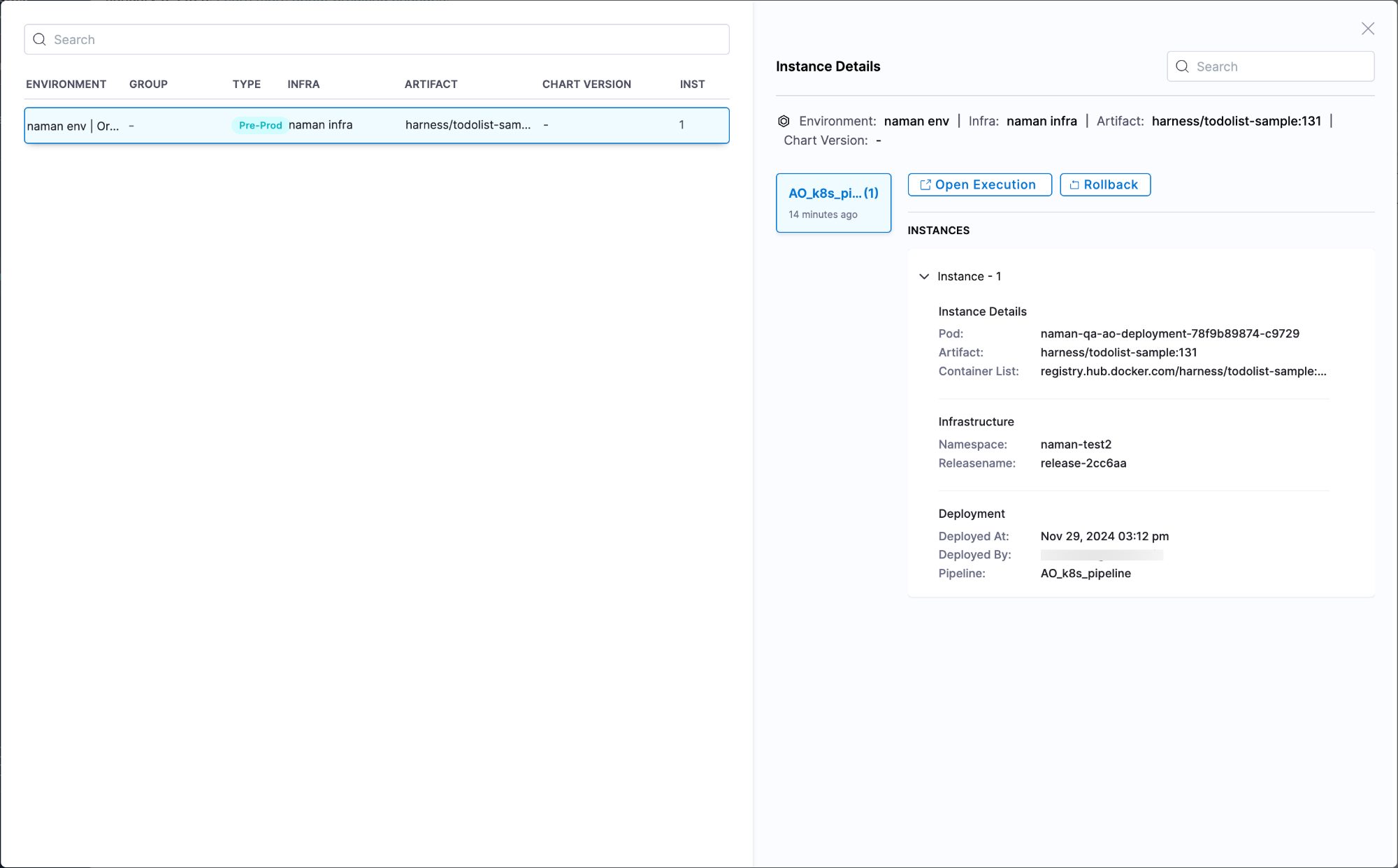 Click on View Instance and Rollback. All executions will be displayed along with their environment details. You can only perform a rollback in the Environment view.