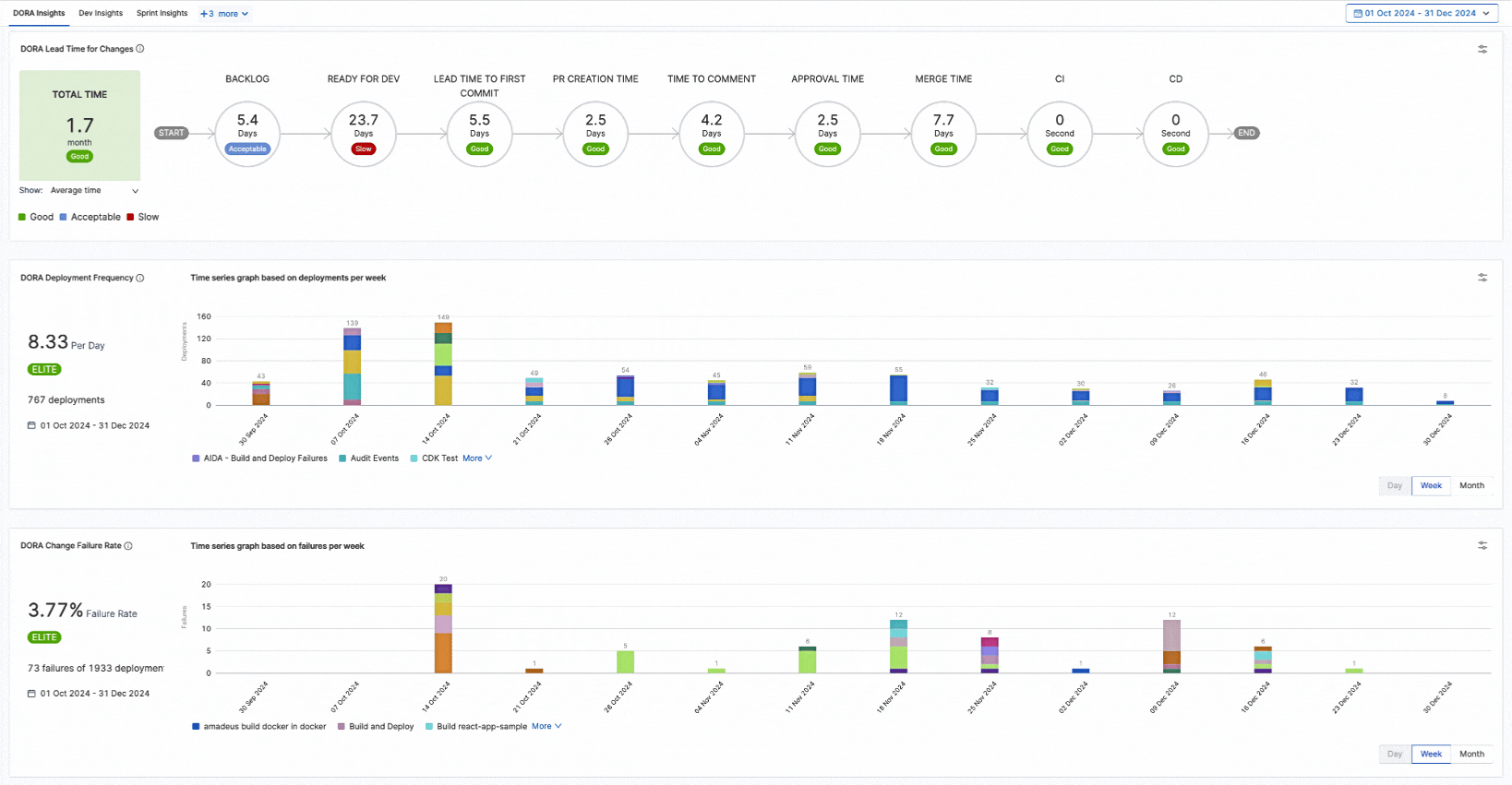 While the DORA metrics dashboard in Harness CD provides visibility into deployment frequency, lead time, failure rates, and recovery times, it focuses primarily on deployment activity within Harness pipelines.