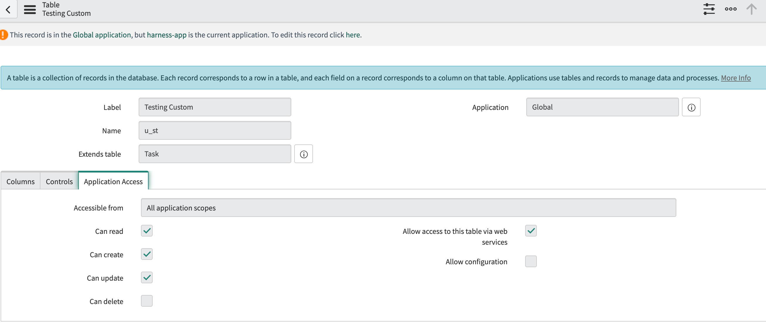 Add three (create, read, write) cross-scope privileges from the harness-app to the global scope with the target name as the table name (u_st in this example) and set the Status as Allowed.