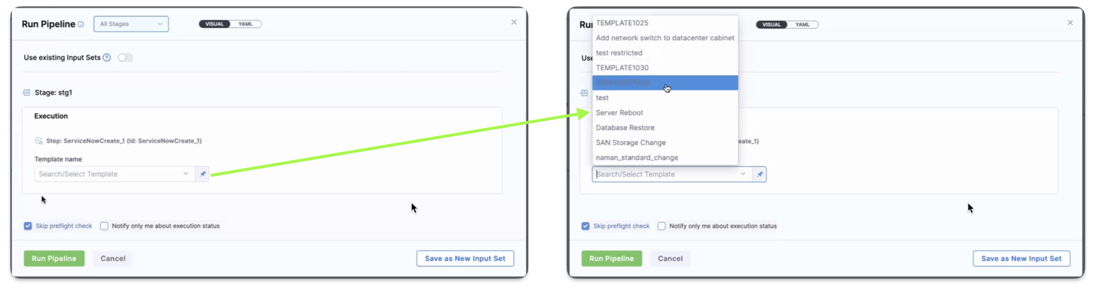 You can also set the template name as a Runtime Input, allowing you to see a dropdown list of available templates during runtime.