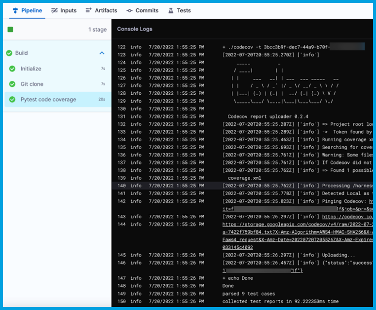 146 info [date] [time] [timestamp] [`info`] {"status":"success","resultURL":"https://codecov.io..."}