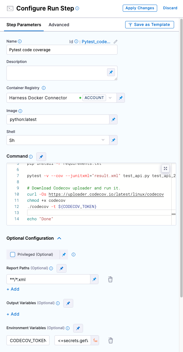 Create a Harness text secret containing your CodeCov Upload Token. Make note of the secret's ID.