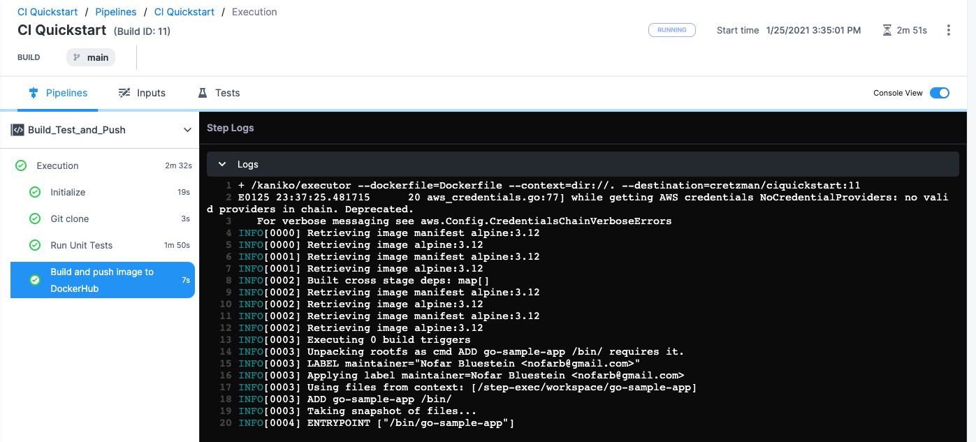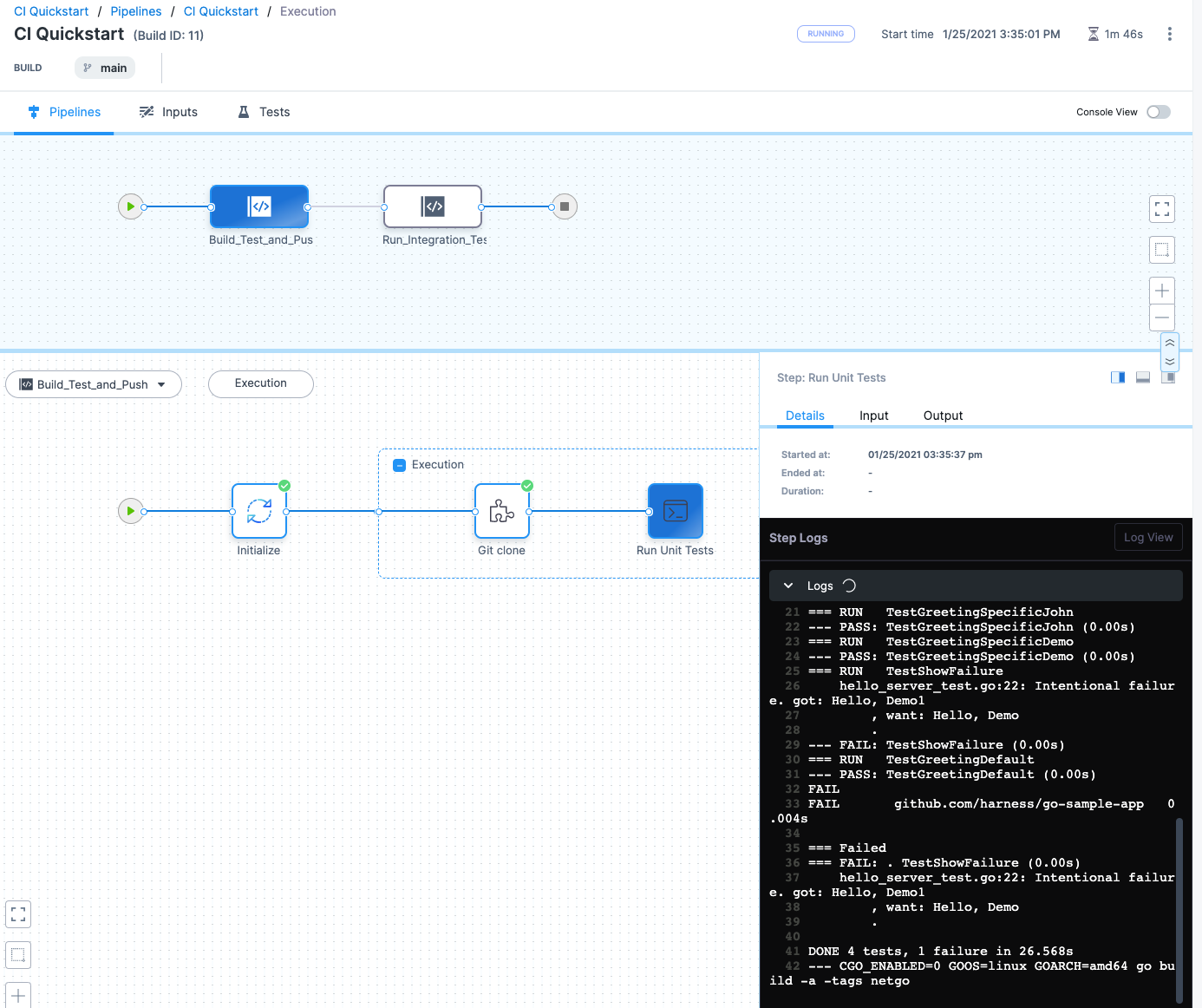 On the Build details page you can observe the pipeline while it runs. Select a stage to examine the steps in that stage. Select a step to view the step's logs. Select the Tests tab to view test results.