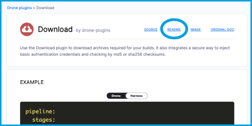 The README link is at the top of each plugin's Drone Plugin Marketplace page.
