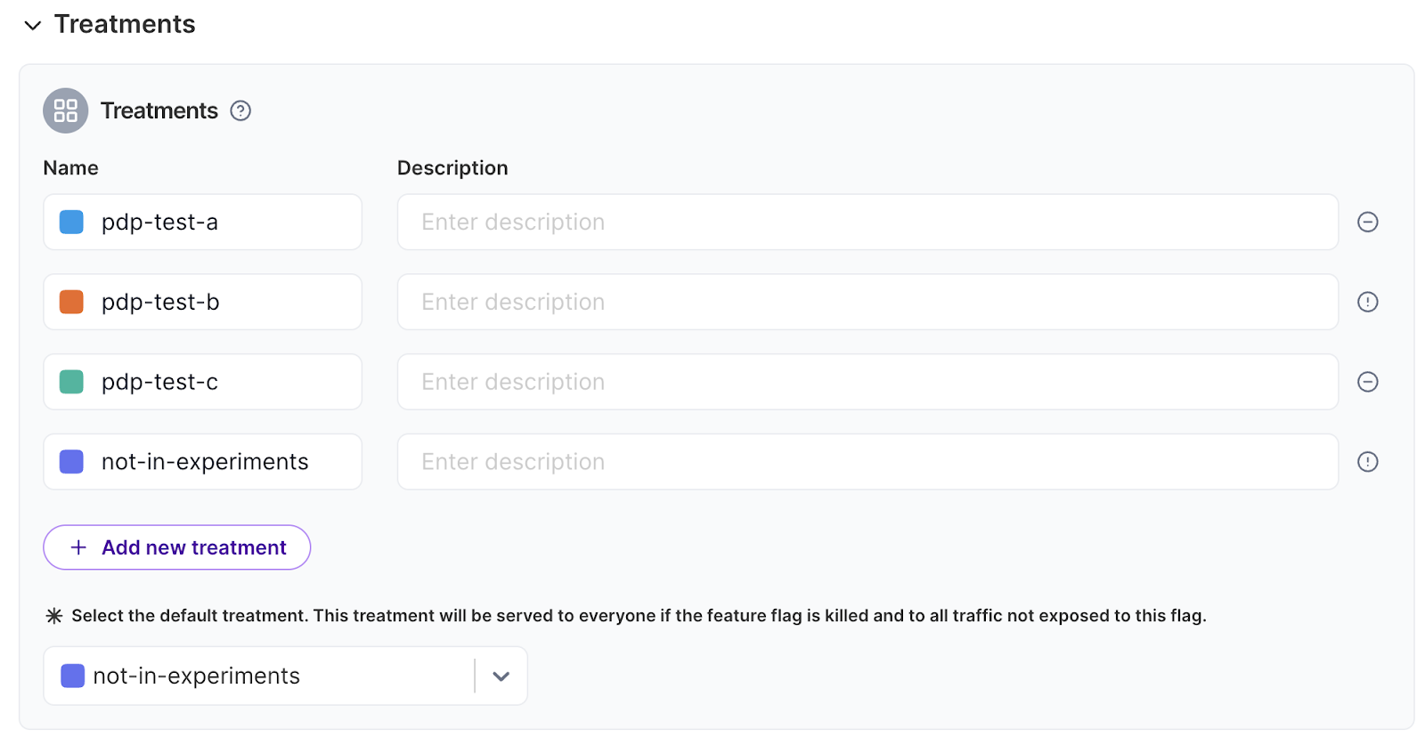 with four treatments, one for each of the experiments, as well as a not-in-experiments treatment. In this example, we use a percentage-based targeting rule to divide traffic, but you could also use attribute-based targeting rules.