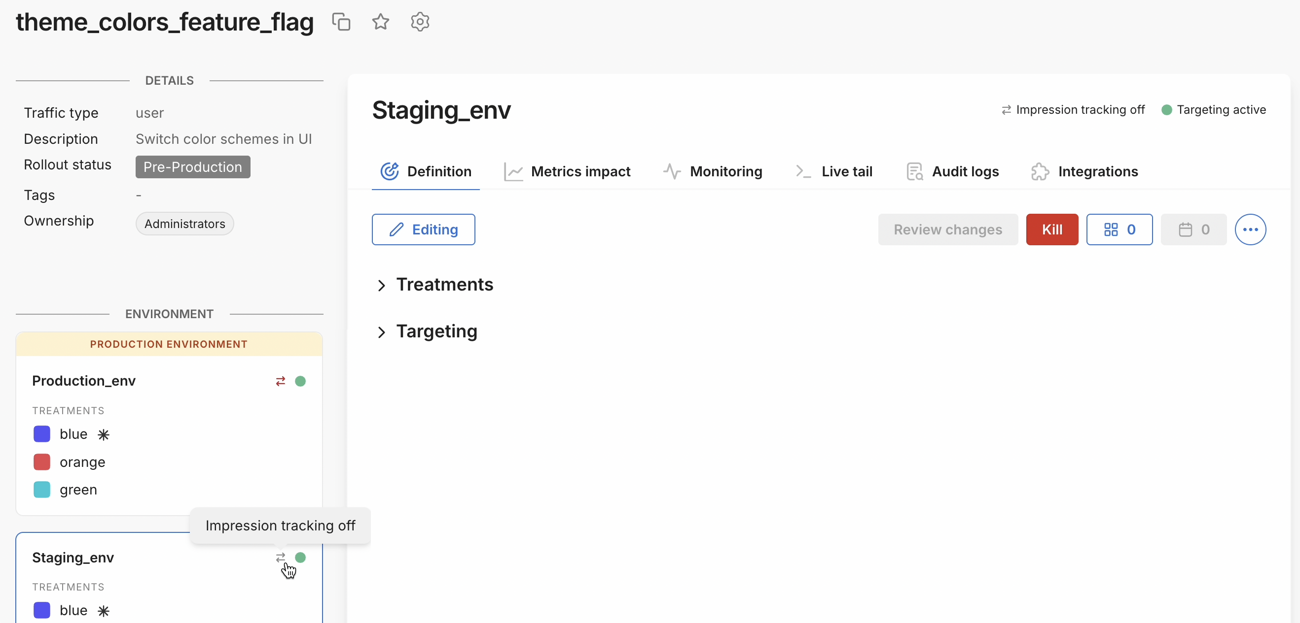 Impression tracking is on by default, but can be turned off for a feature flag definition. By selectively toggling off impression tracking, you can control the volume of impressions sent to third-party integrations.