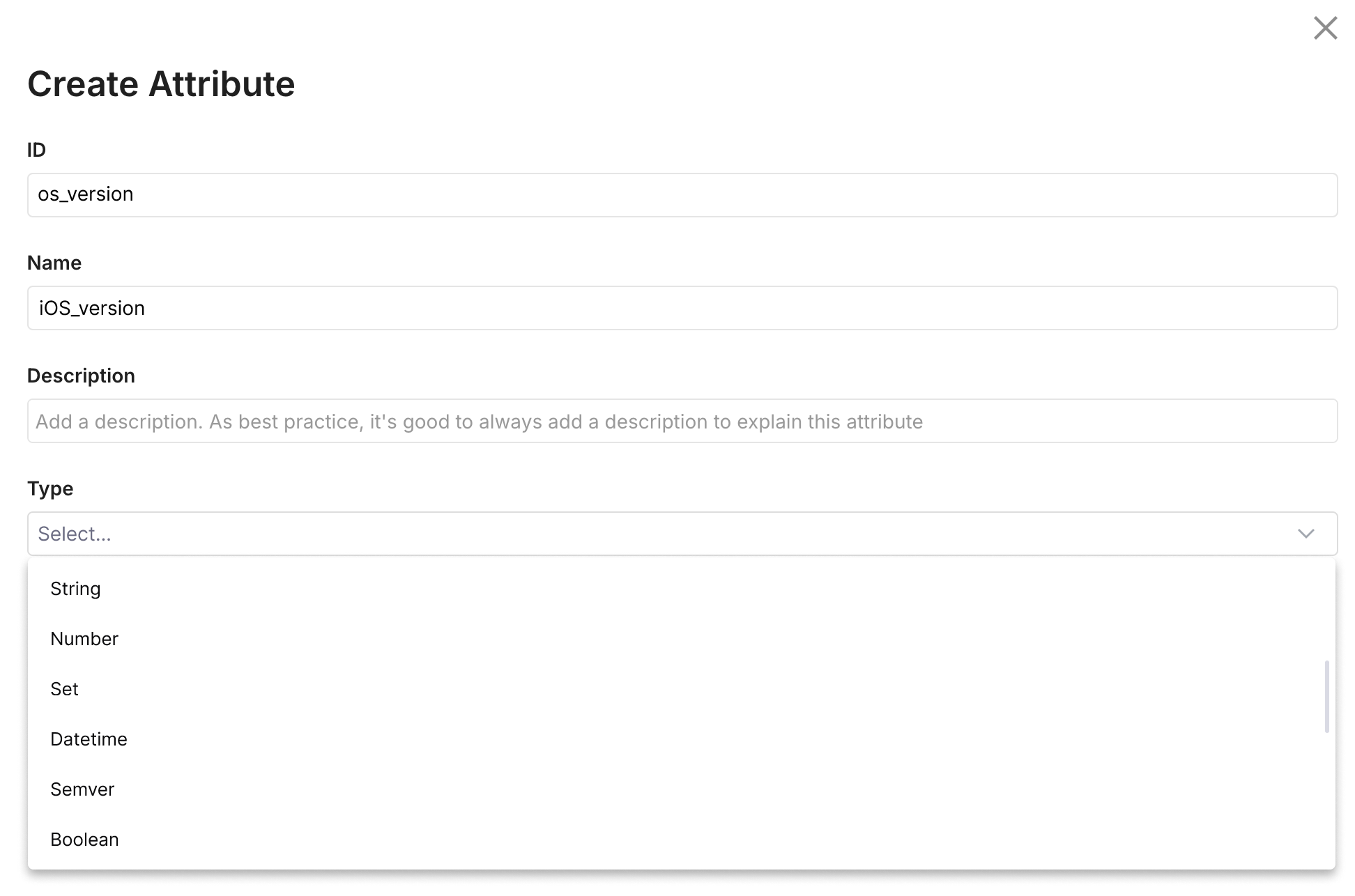 In the Type dropdown, select an attribute value type (e.g., String to represent text values, Boolean to represent true or false values, etc.).