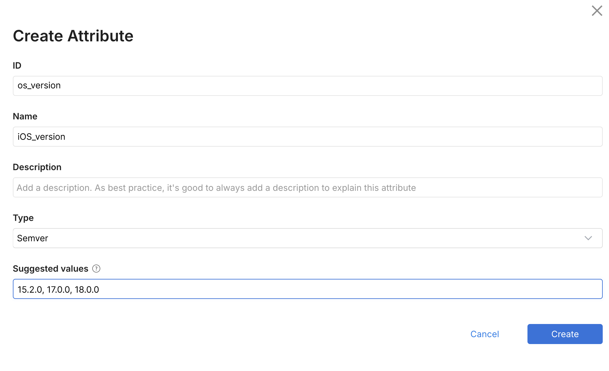 . SemVer is not currently supported. - SuggestedValues (only used with String attributes) - Suggested values must be a double-quoted value or list of values. You can define up to 100 suggested values, each up to 50 characters long. (In Harness FME, attribute suggested values will appear in feature flag attribute-based targeting rules in the attribute value field.)