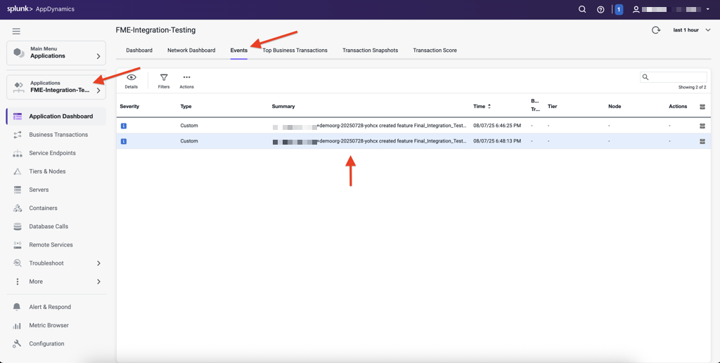 In Splunk AppDynamics, navigate to Applications and click on the application you configured in the Harness FME configuration (for example, FME-Integration-Testing