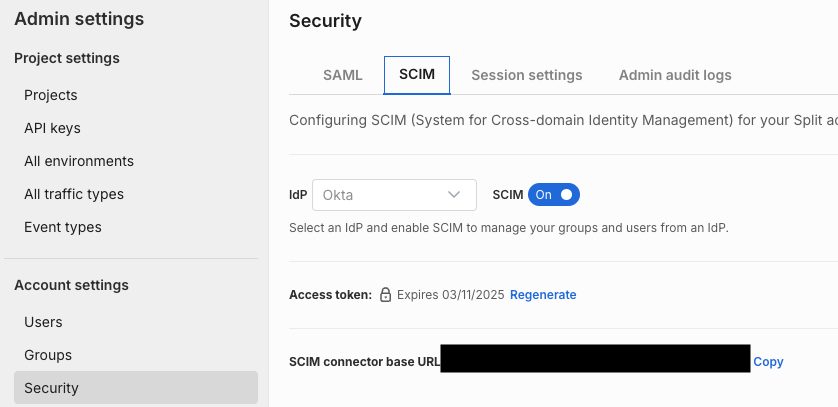 In the SCIM connector base URL field, copy and paste the connector base URL generated in Split when you enabled SCIM.