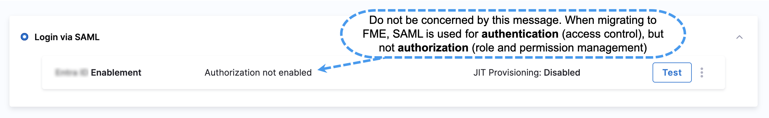 A: This is expected, and OK. When migrating to FME, SAML is used for authentication (access control), but not authorization (role and permission management).