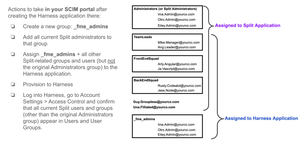 The Split migration process will place all of your current Split Administrators in a Harness User Group called All FME Admins and grant this User Group the appropriate RBAC permissions for you. All you need to do is configure SCIM to maintain that list (instead of Split_Administrators