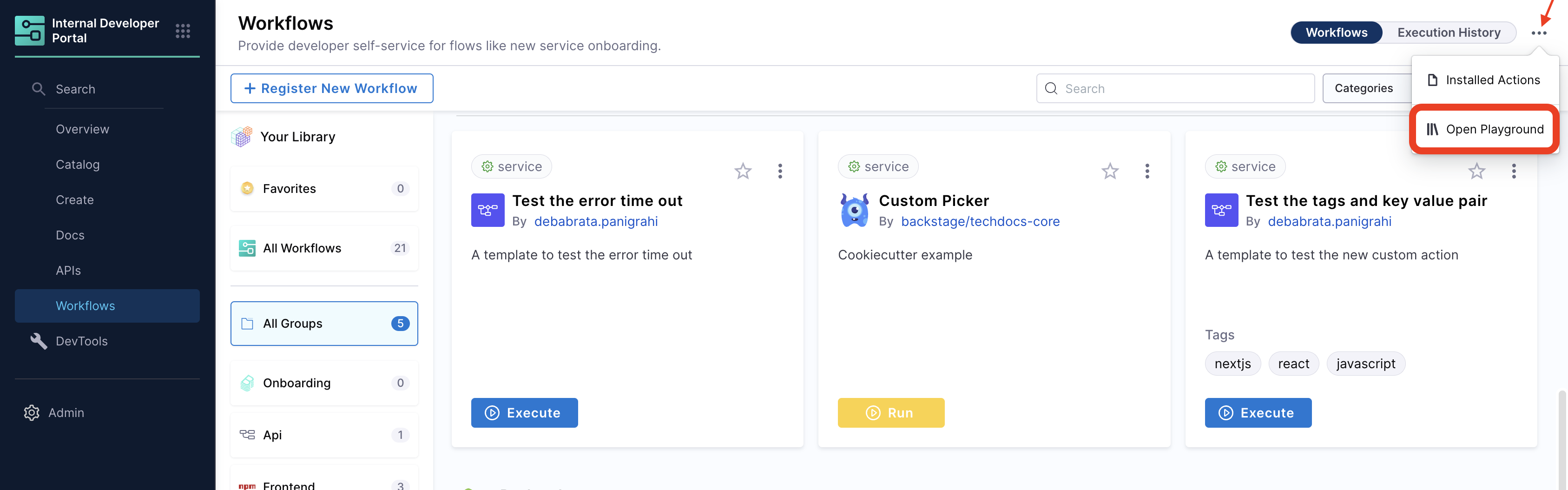 - Go to your Workflows page. Click on the three dots in the top right corner and select Open Playground.