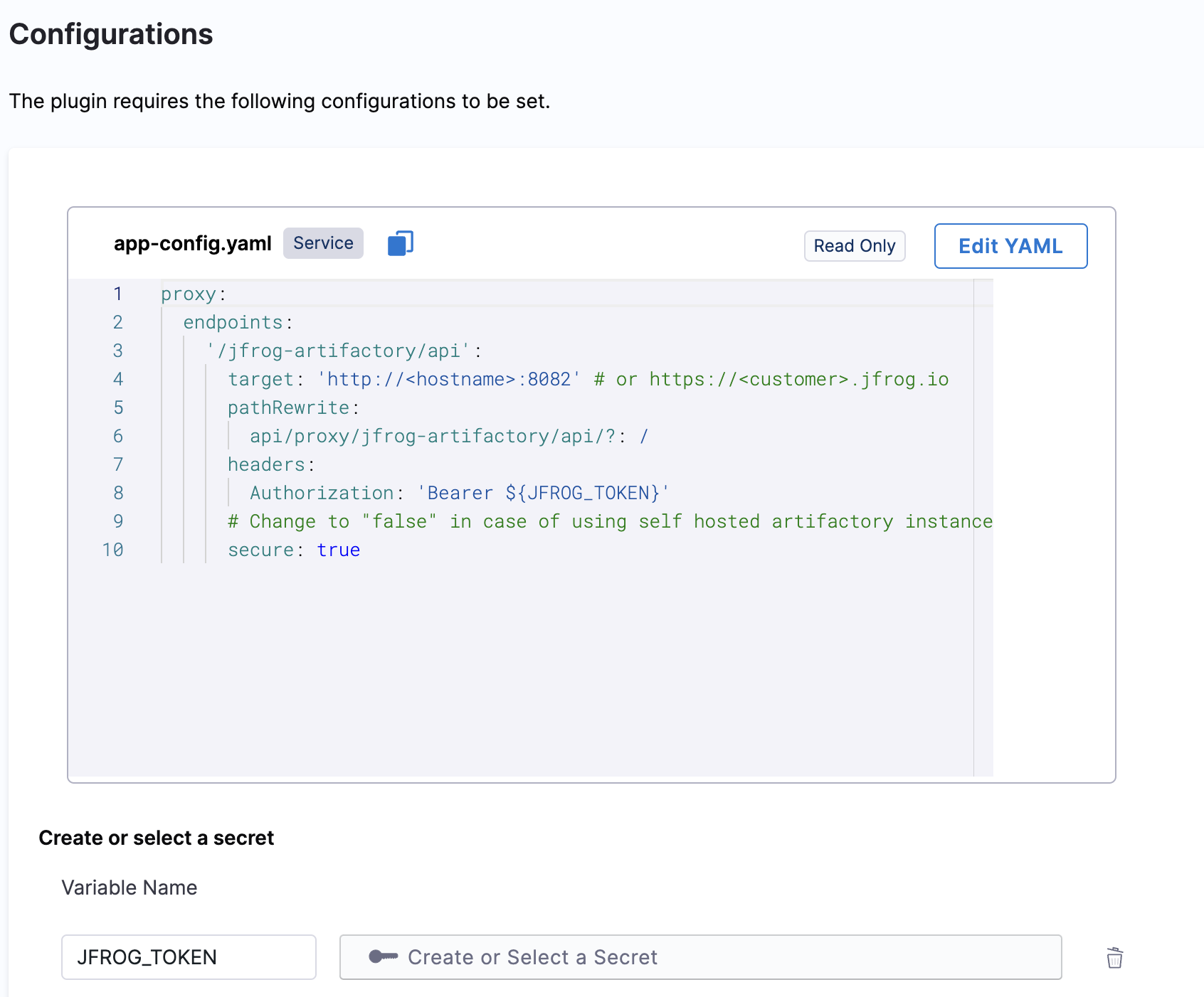 This plugin requires a backend proxy configuration to make calls to JFrog with authentication.