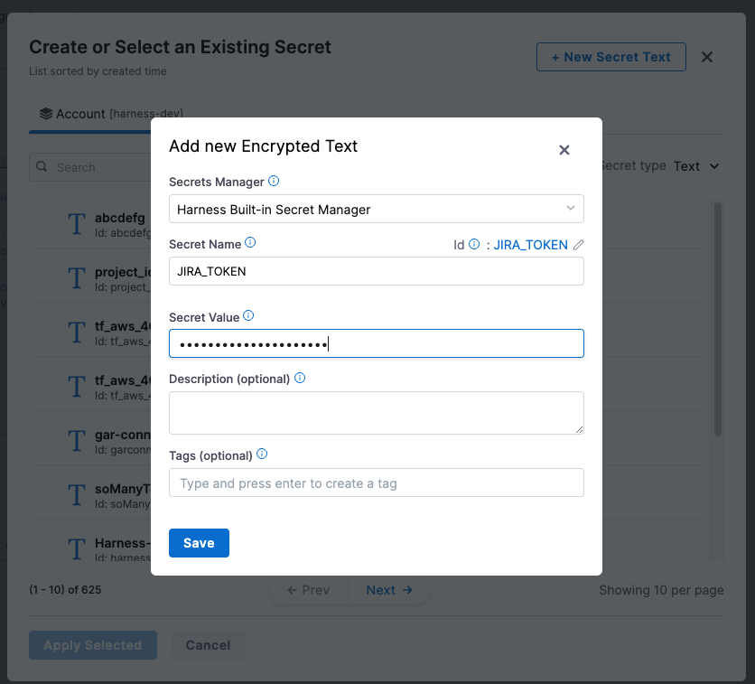 - Create secret in Harness to store API token: Once token is generated, click on the “input field” next to
