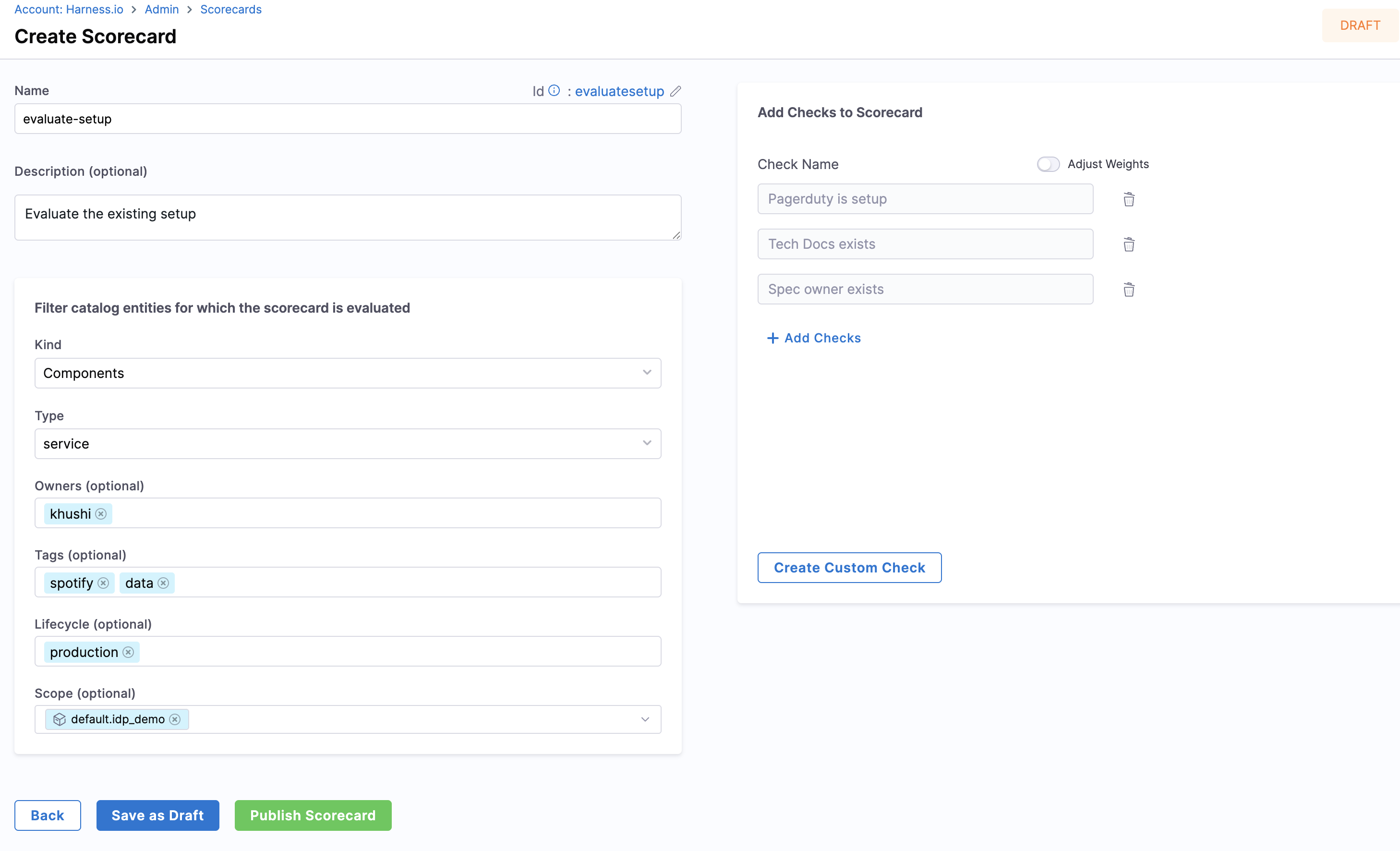 • Scope (optional): Choose where to run the evaluation- project, org, or account. The scorecard evaluates all entities within the selected scope. If no scope is selected, it evaluates entities across all scopes (account, org, and project).