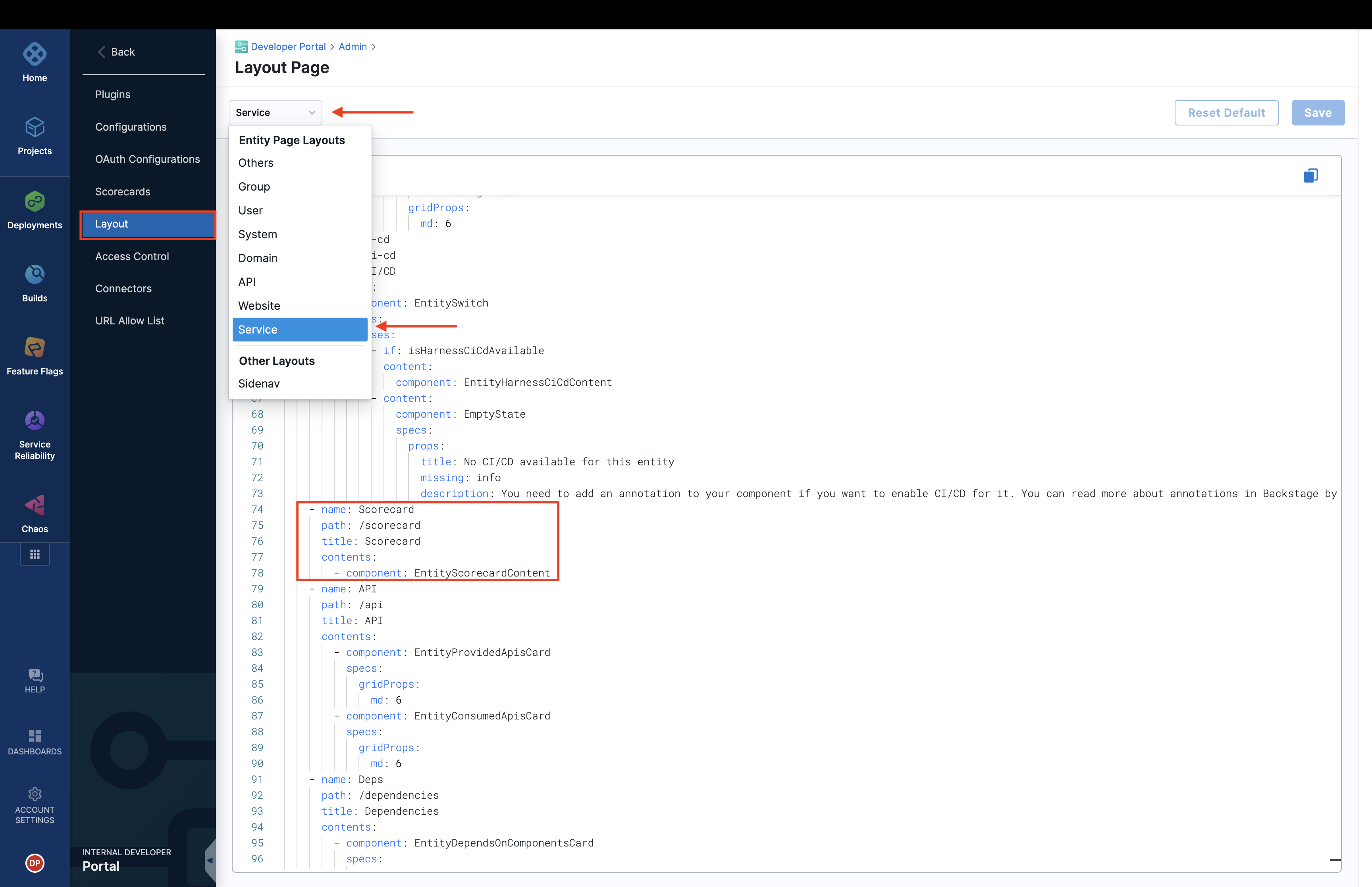 • Go to the Layout section in IDP Admin, and select Service or any other kind of catalog entity for which you want to add Scorecards.