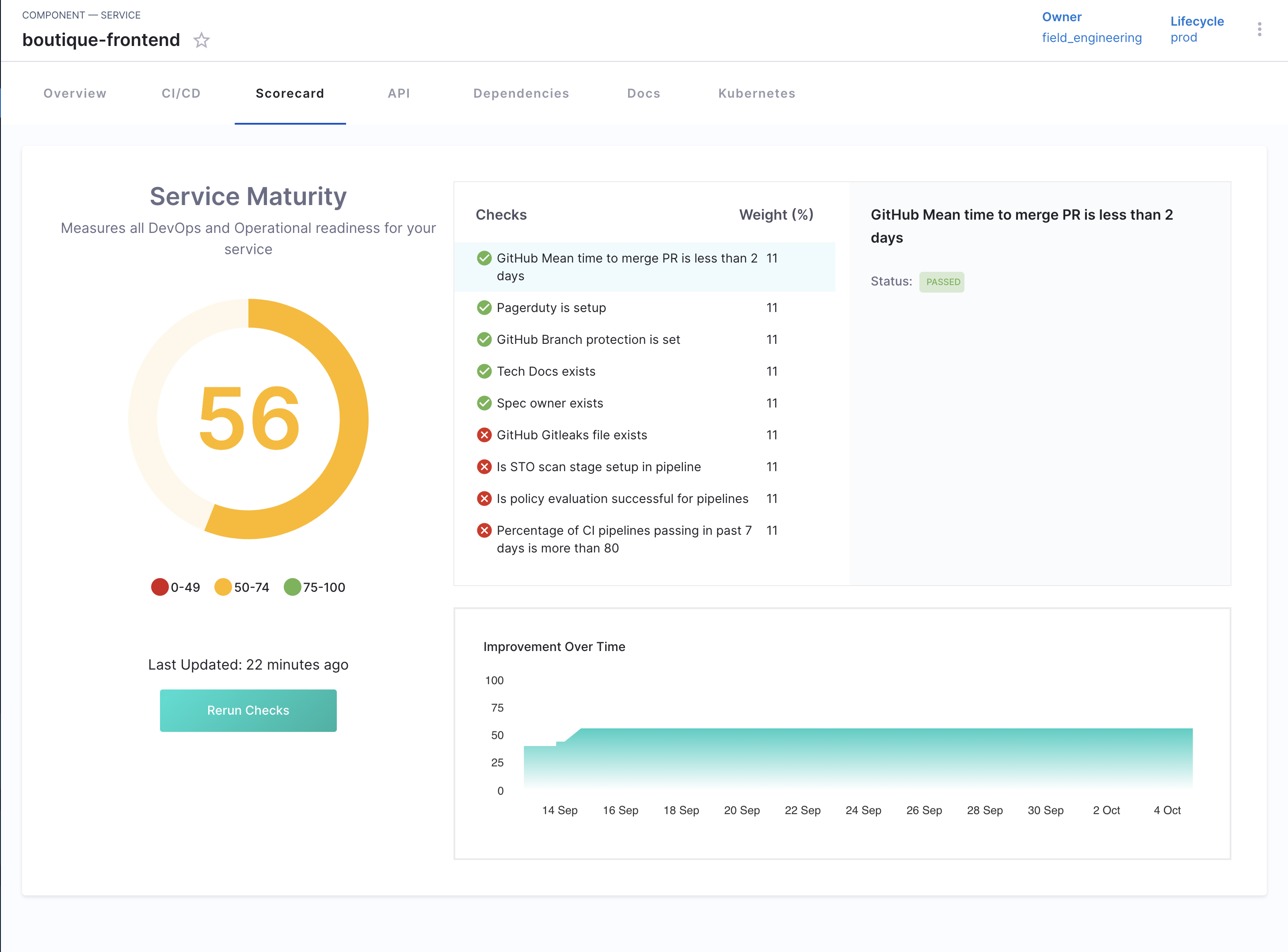 Scorecard has two main UI components which are developer facing and lives in the Catalog - 1. A small Card for the Overview page with the scores and, 2. A Tab view with details of the checks and how the score got computed. This is illustrated below. The Tab view contains detailed comprehensive information as shown in the image under overview