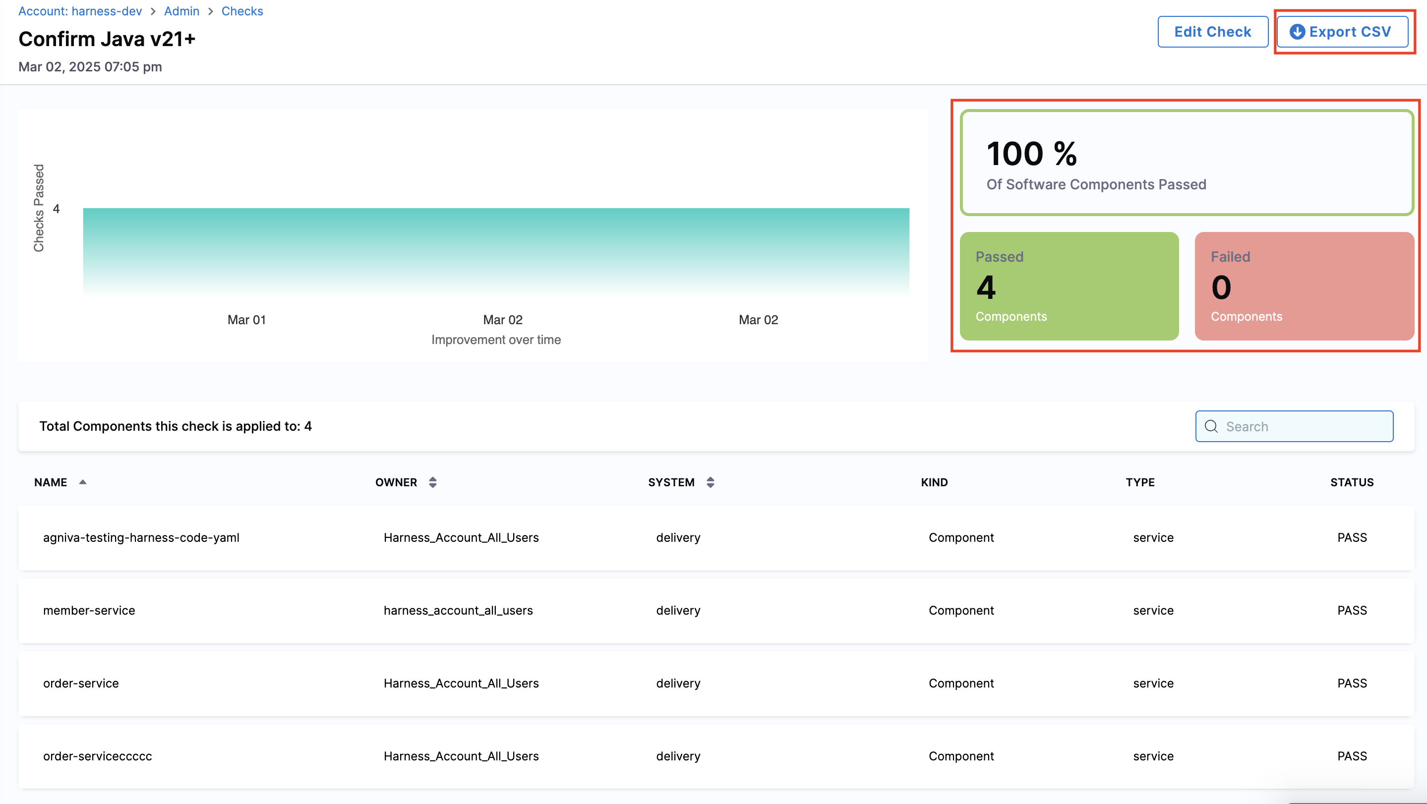 5. The dashboard will open, displaying component-wise details and insights. You can export the aggregate data by clicking "Export CSV" to download it in CSV format.