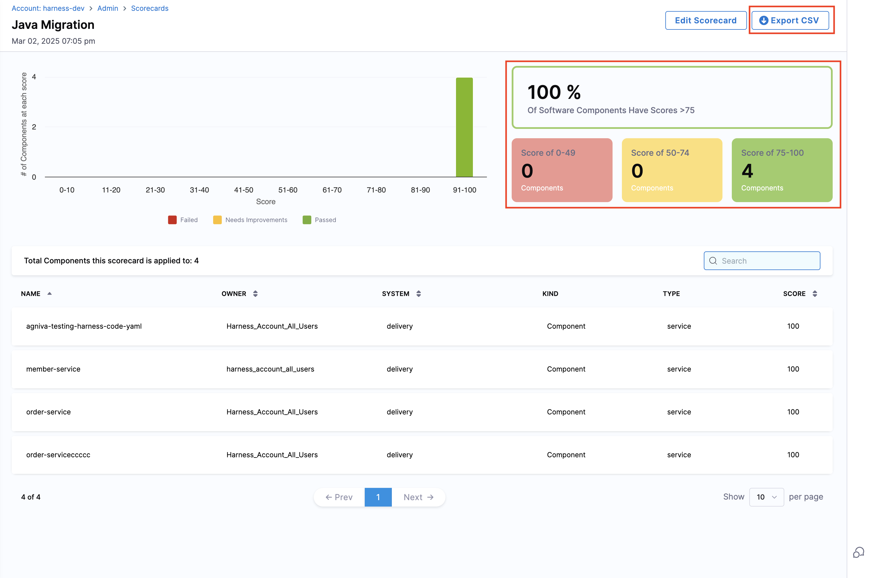 4. The dashboard will display all components where the Scorecard was executed along with their detailed scores. You can export the aggregate data by clicking "Export CSV" to download it in CSV format.