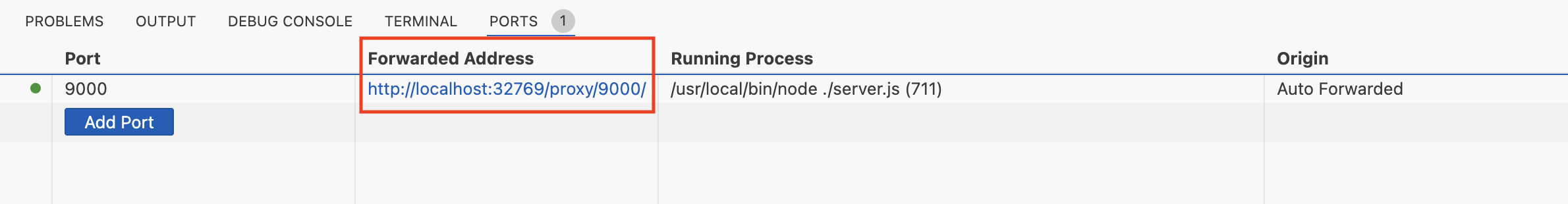 - To access the forwarded port URL, go to the "Ports" section in your IDE terminal. From there, you can easily open the forwarded port URL.