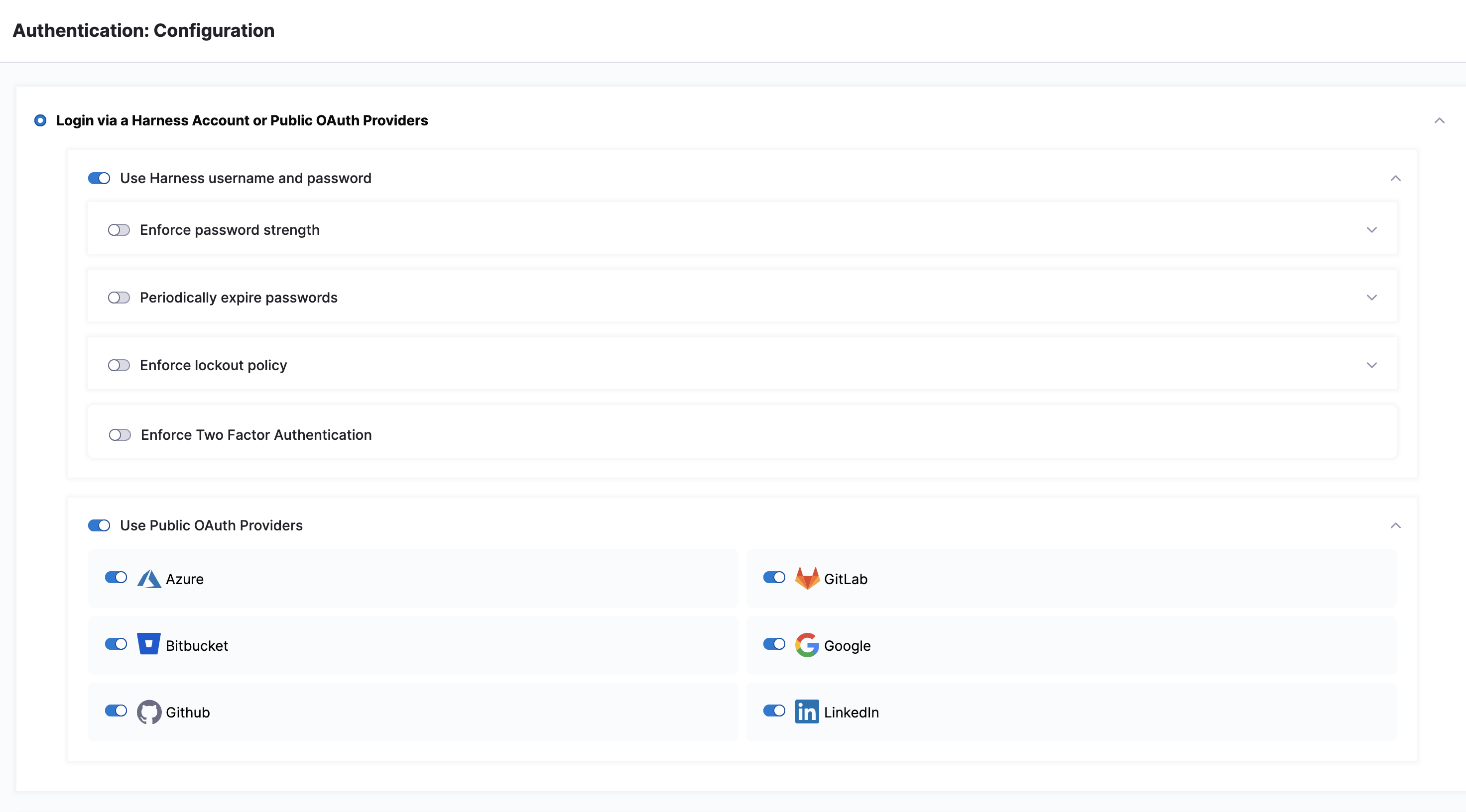 In the Use Public OAuth Providers section, you can enable Harness logins via a range of single sign-on mechanisms. Enable this slider to expose sliders for enabling individual OAuth partners. For more on OAuth Providers, go to Single Sign-On with OAuth.