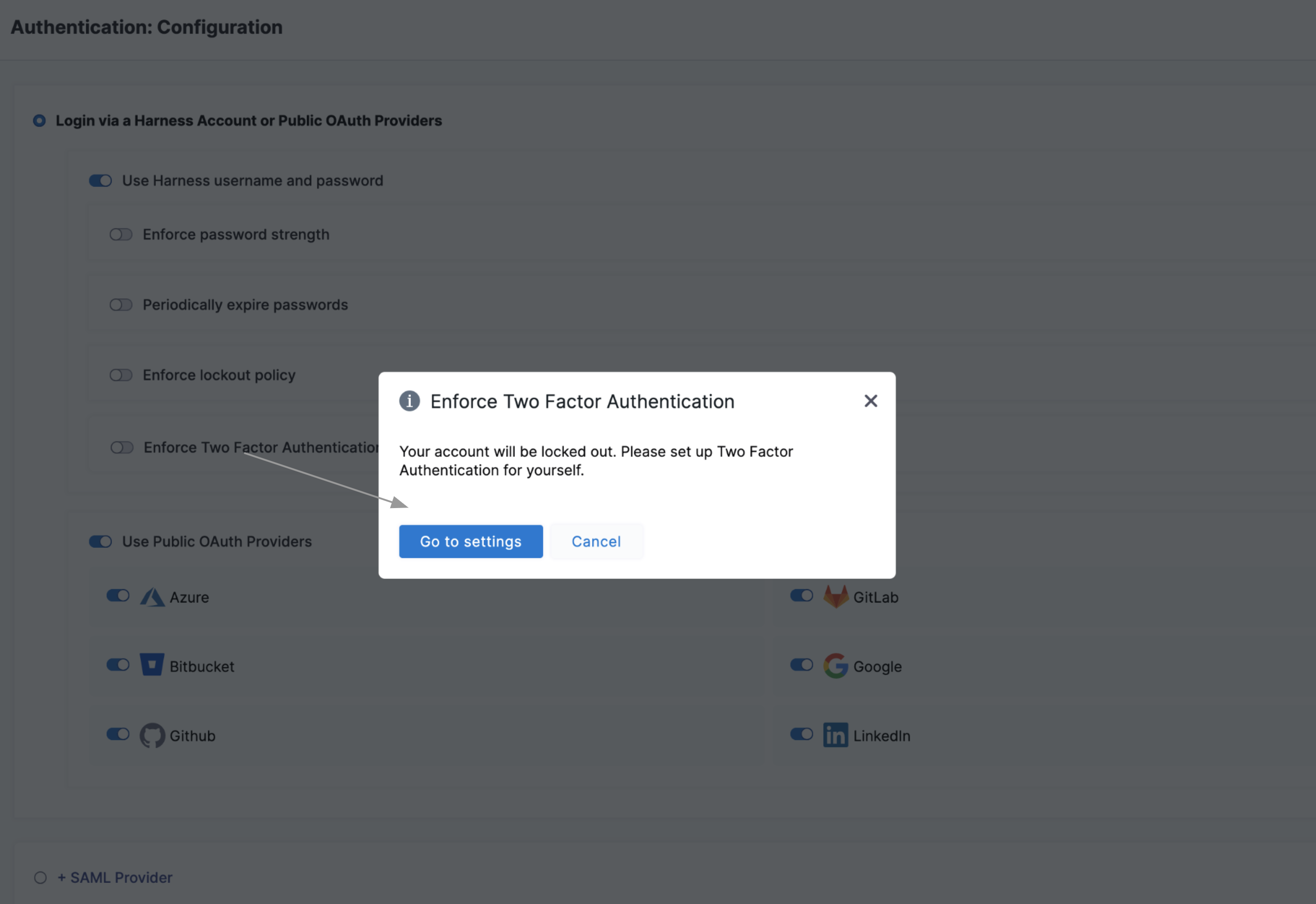 Select Enforce Two Factor Authentication to enforce 2FA for all users in Harness. This option will govern all logins — whether through SSO providers or Harness username/password combinations. For more information on Two-Factor Authentication, go to Two-factor authentication.