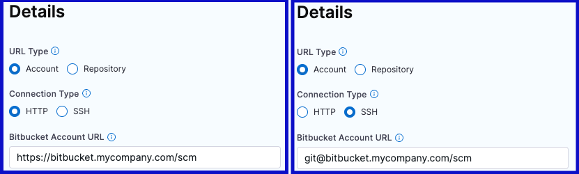 Select the protocol, HTTP or SSH, to use for cloning and authentication. The Connection Type determines the URL format required for the Bitbucket Account/Repository URL field. It also determines the Authentication method you must use in the Credentials settings.
