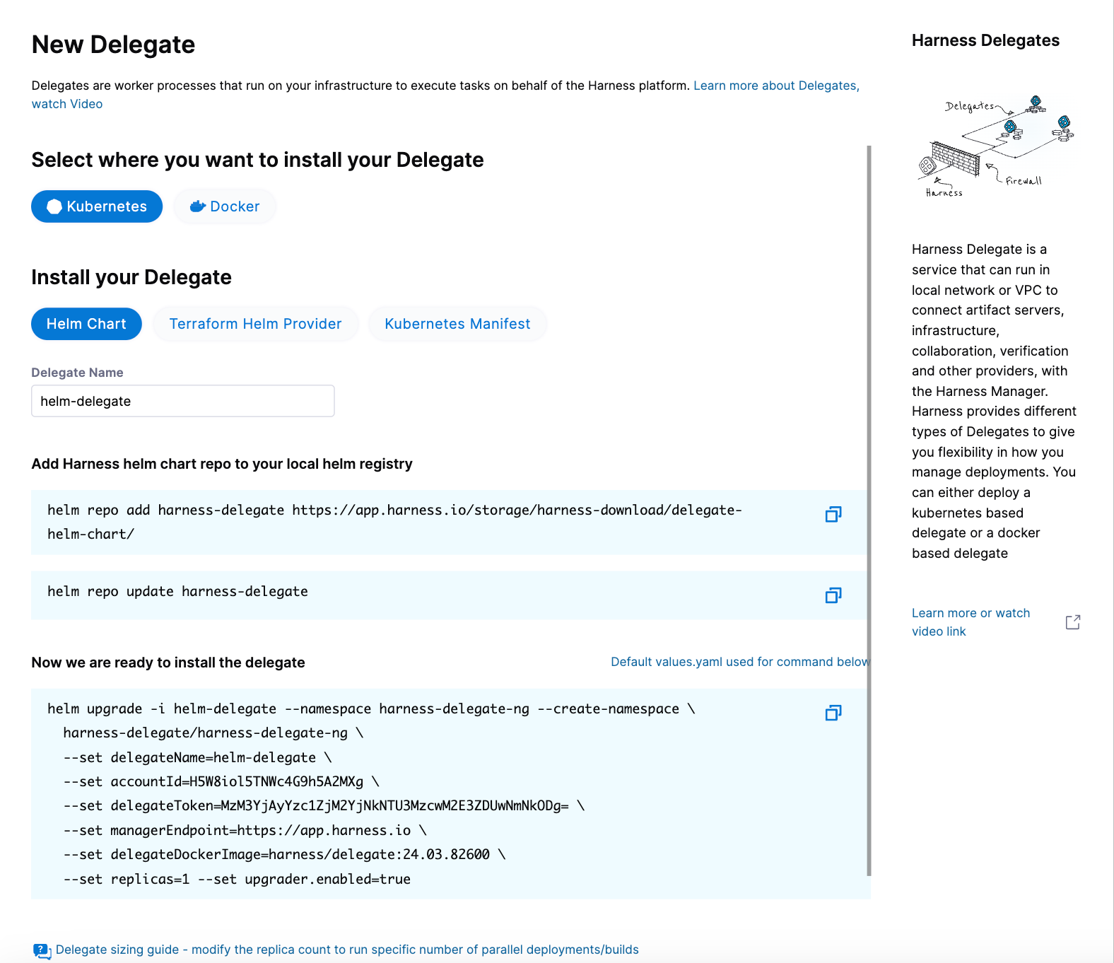 Expand the section below for instructions on installing the default delegate for your Harness account. It can be either a Kubernetes delegate installed using a Helm chart, Terraform Helm Provider, or Kubernetes manifest or a Docker delegate using the docker run