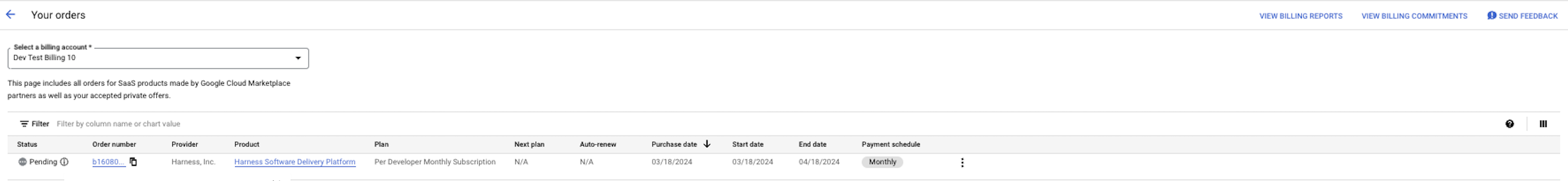 Navigate to Marketplace and go to the Orders section. Initially, your order is in a pending state while the Harness system approves and activates your account. The activation can take several minutes.