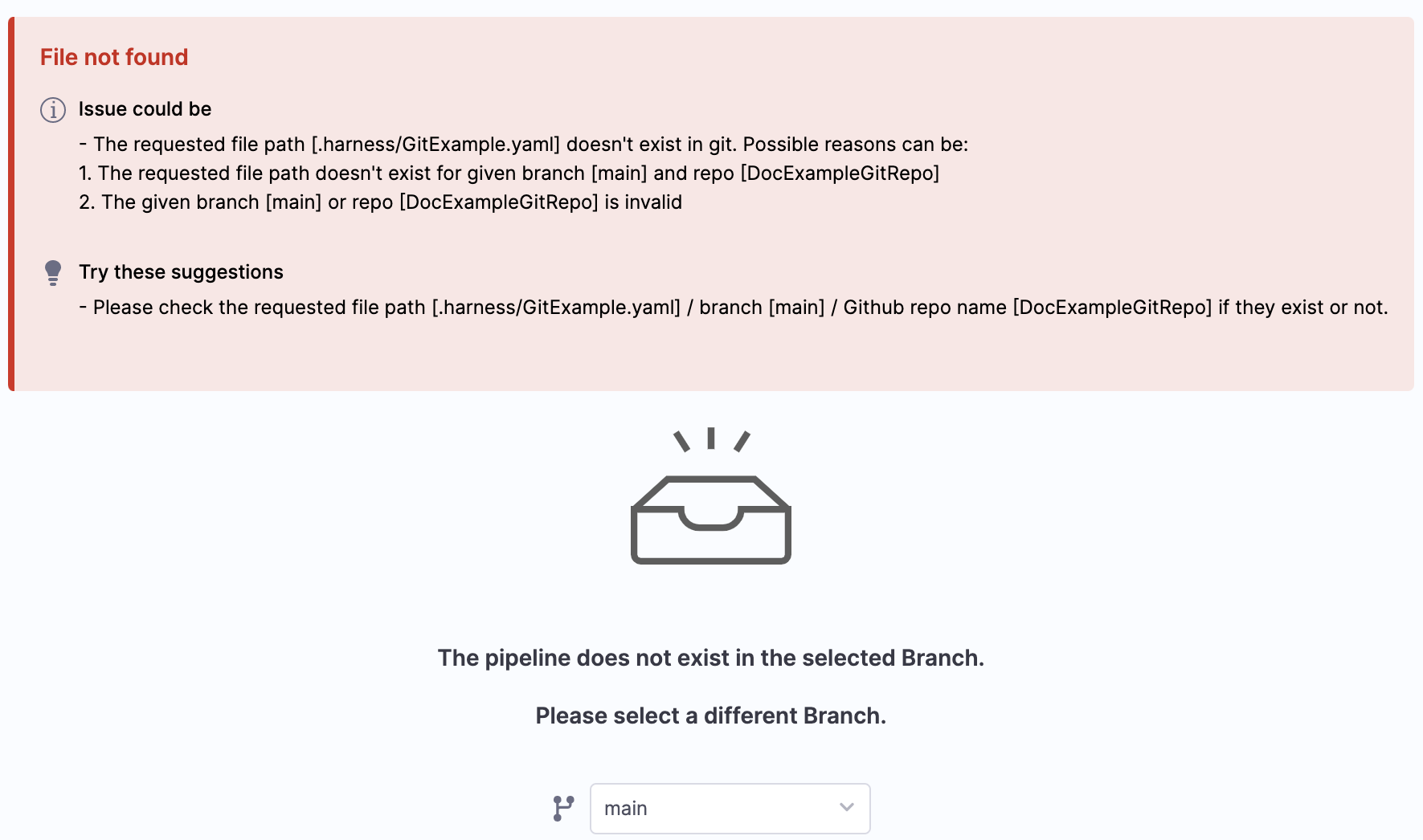 By default, Harness fetches your Pipeline details from the default branch. If you have imported Pipeline from some other branch you will see the below error.Select the branch from where you imported the Pipeline and continue.