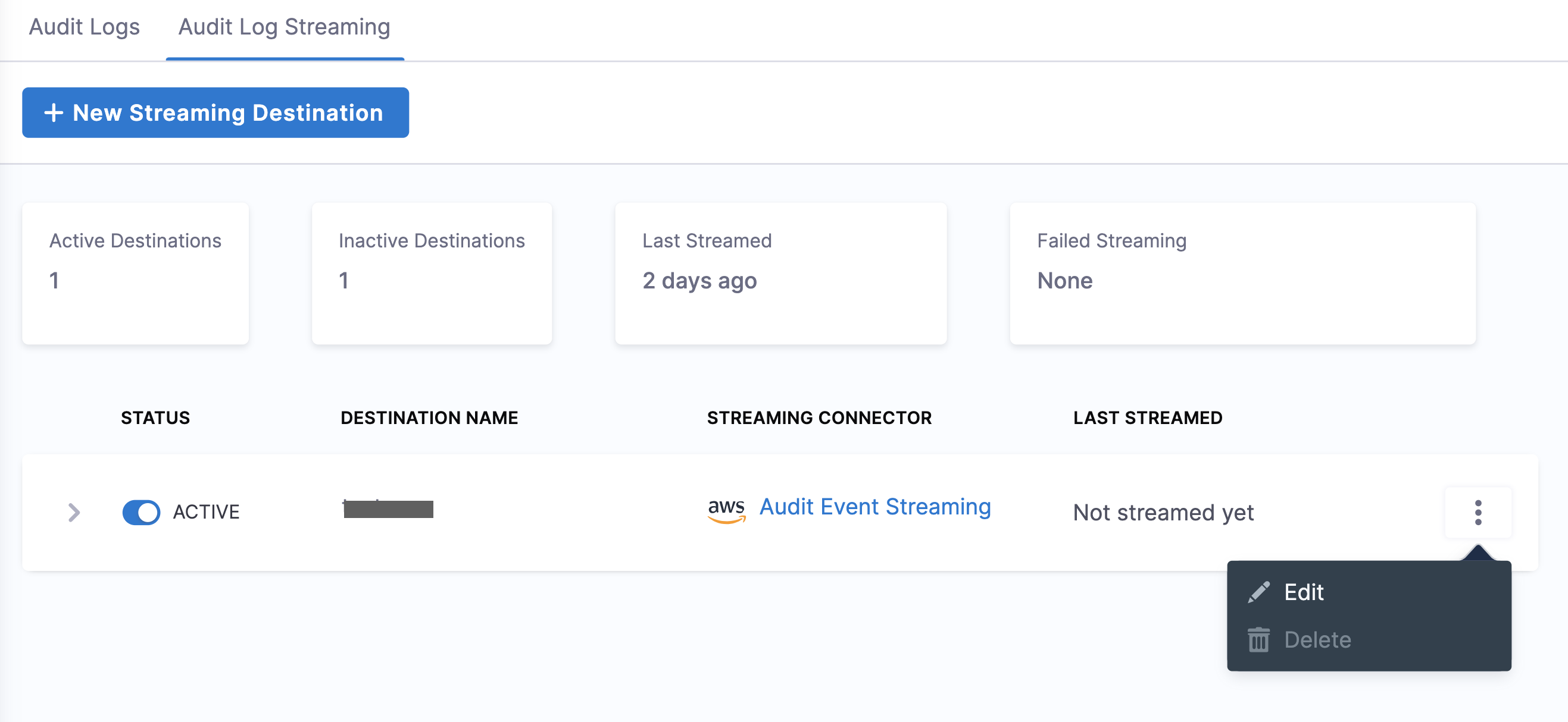 The streaming destination gets configured and appears in the list of destinations under Audit Log Streaming. By default the destination is inactive.