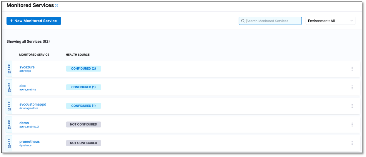 1. In Harness, select Deployment > Monitored Services. A list of monitored services is displayed. The list also displays the number of health sources configured for each monitored service.